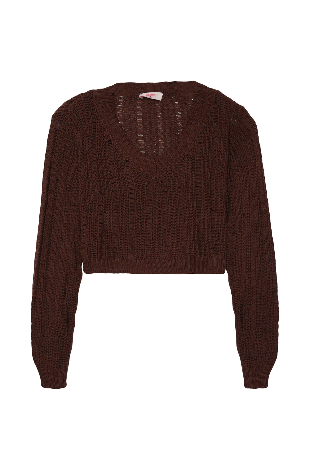 Vatkalı V Yaka Crop Triko Koyu Kahve