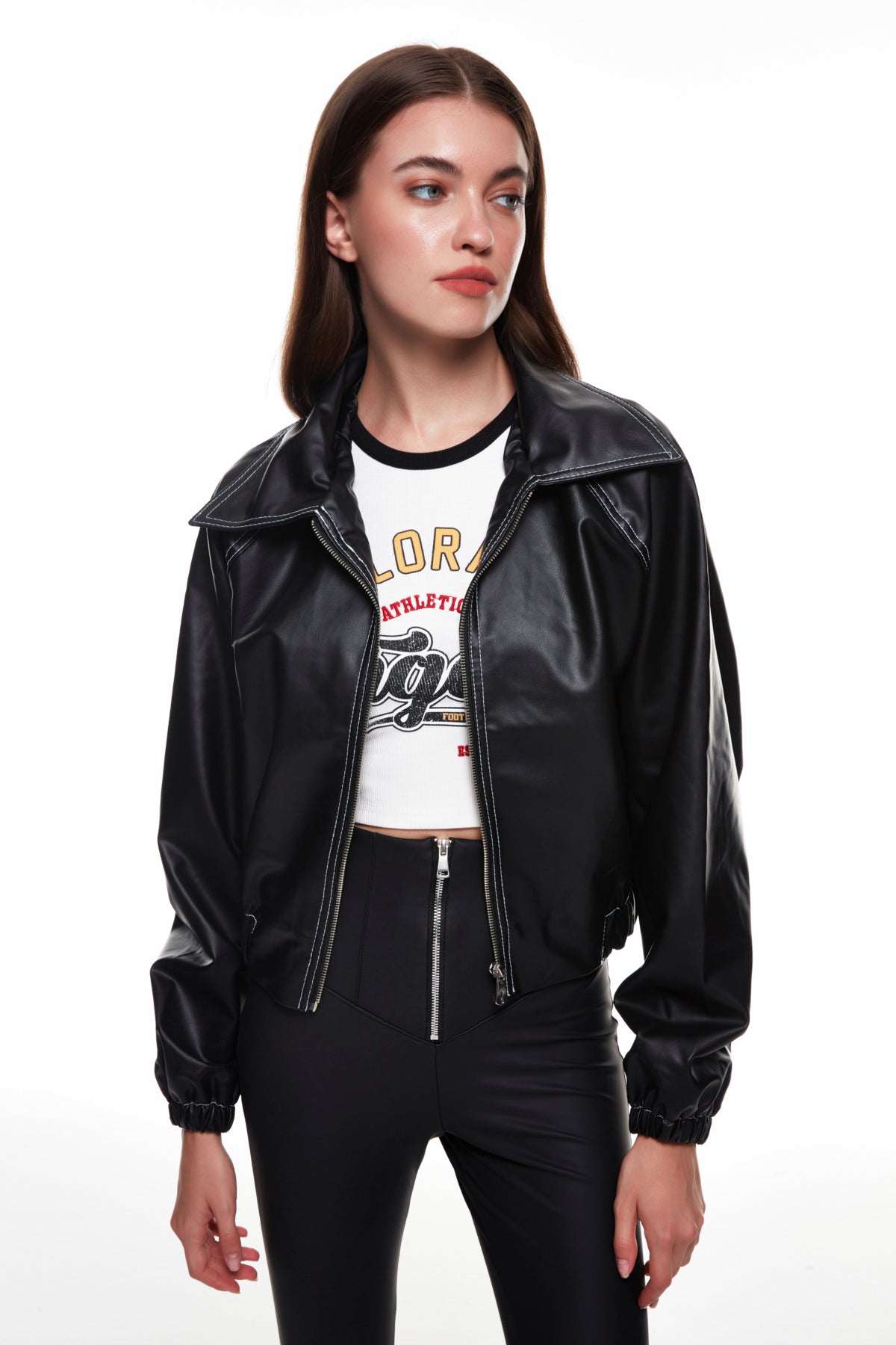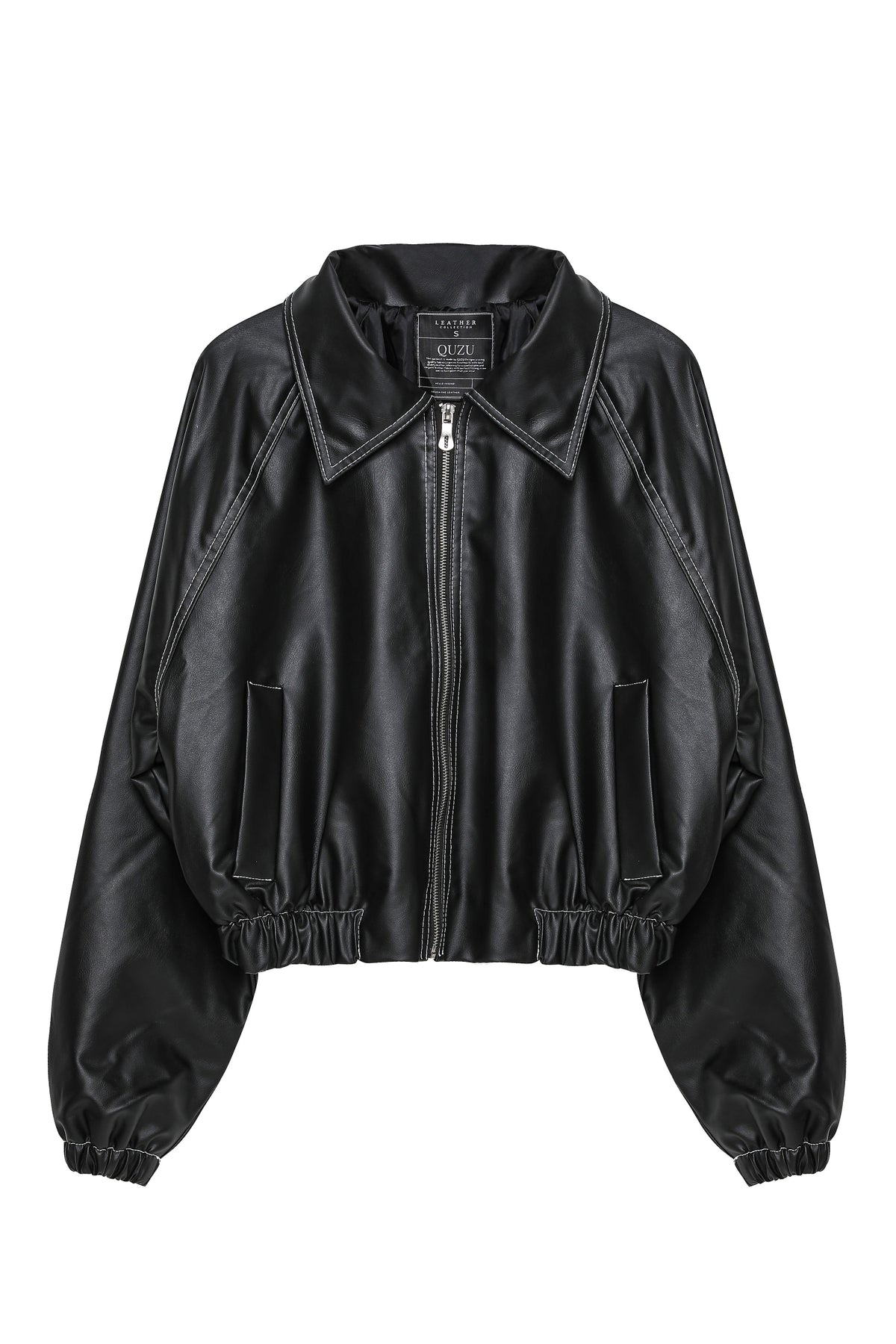 Elastic Waist Zippered Leather Jacket Black