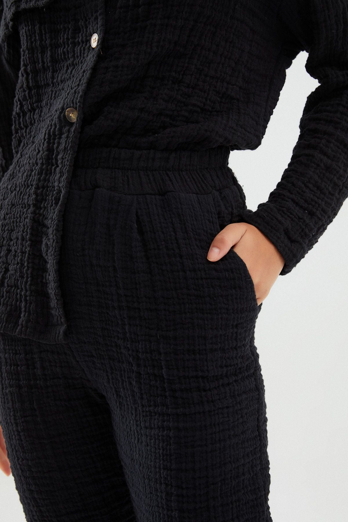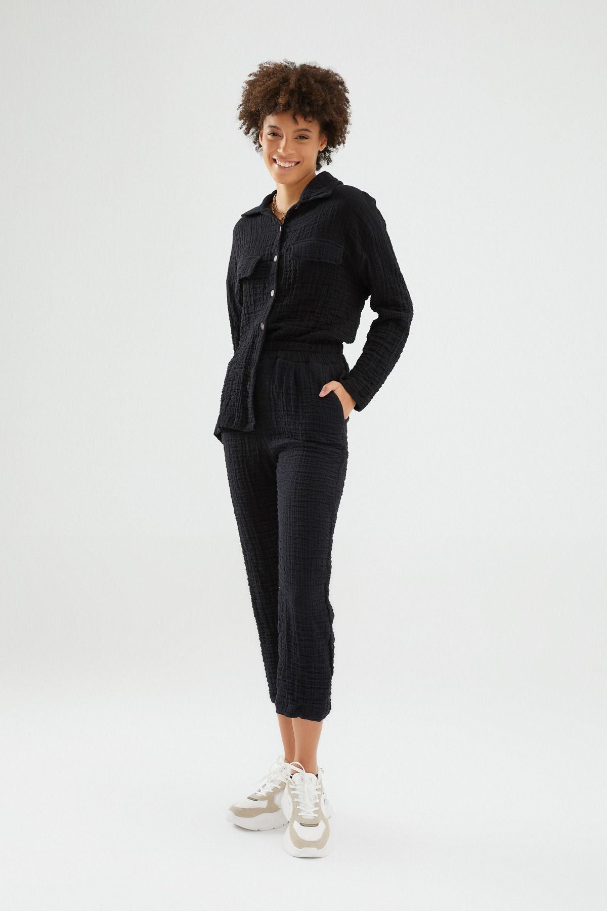 If you want to catch a shabby atmosphere in your daily combinations with its 100% cotton texture, comfortable form trousers are exactly the type you want. You can combine the trousers model, which will add a different atmosphere to your combinations with its textured detail, with an oversized shirt. It provides comfortable wear with its elastic waist structure. It has pockets.
