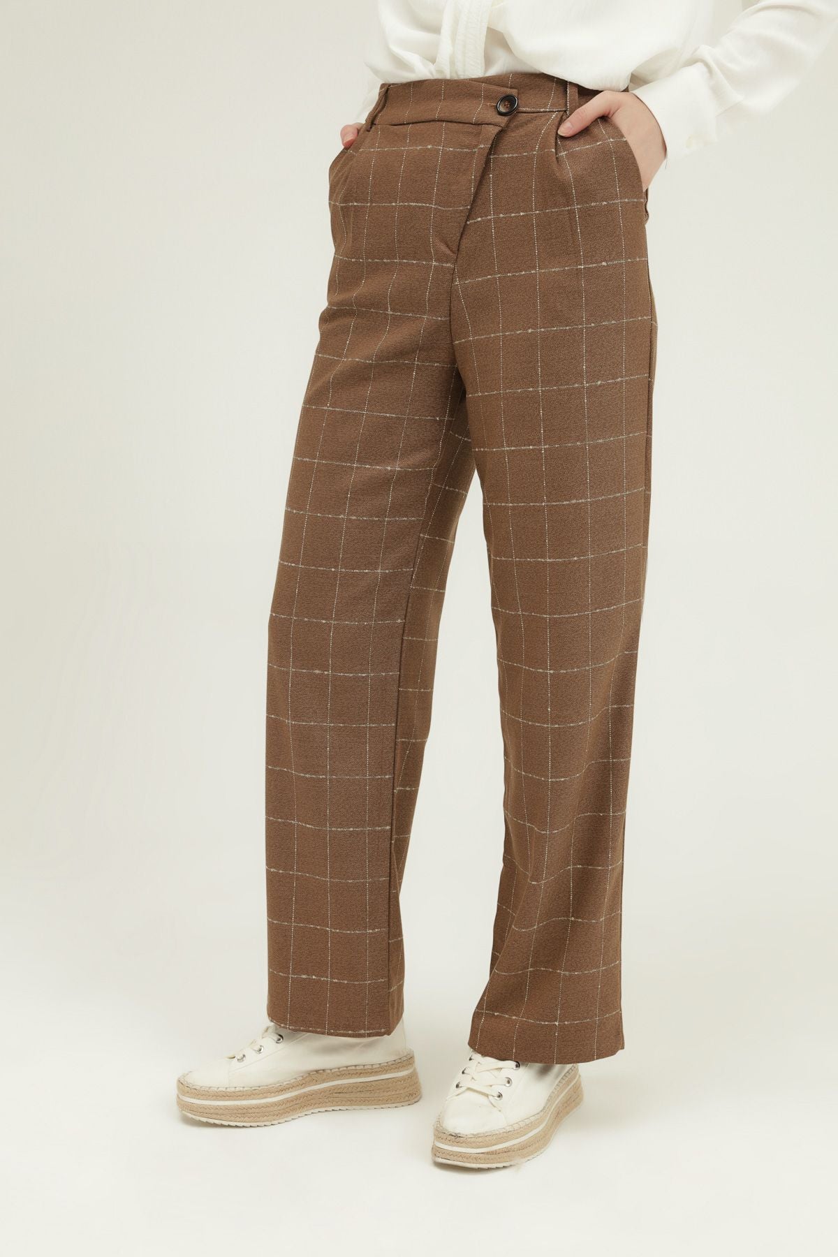 Square-patterned straight-leg palazzo trousers stand out with their asymmetrical closing detail. Palazzo trousers with two pockets balance your office elegance with its white square detail.
