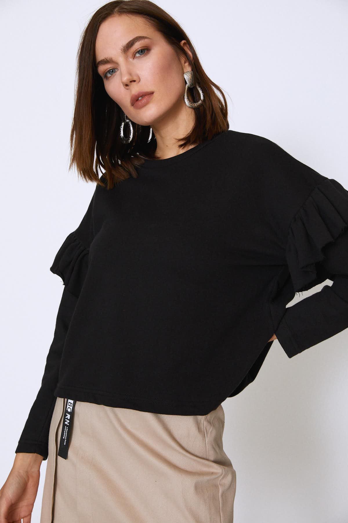Crew Neck Sleeves Frilly Sweatshirt Black