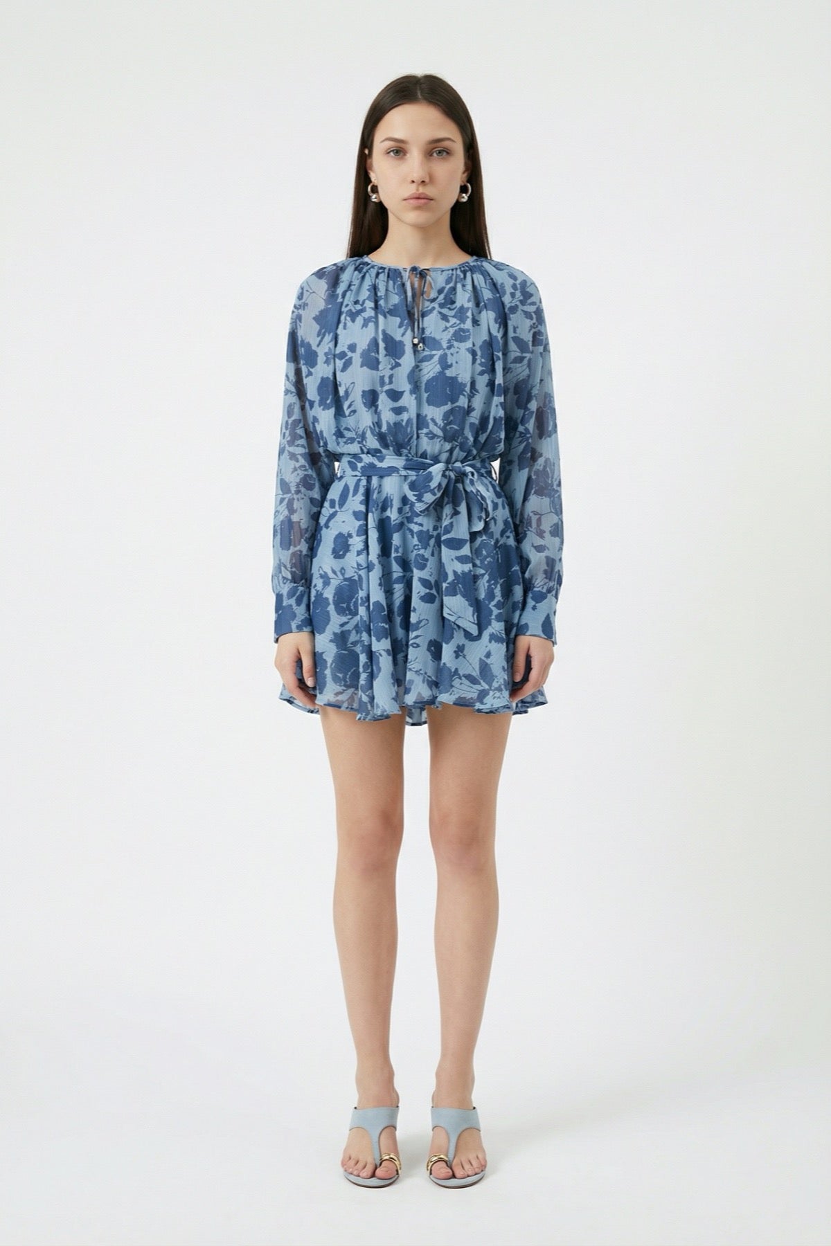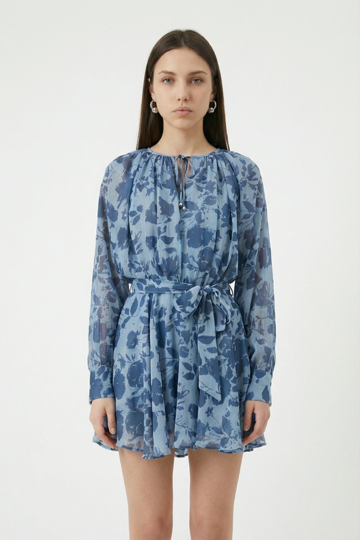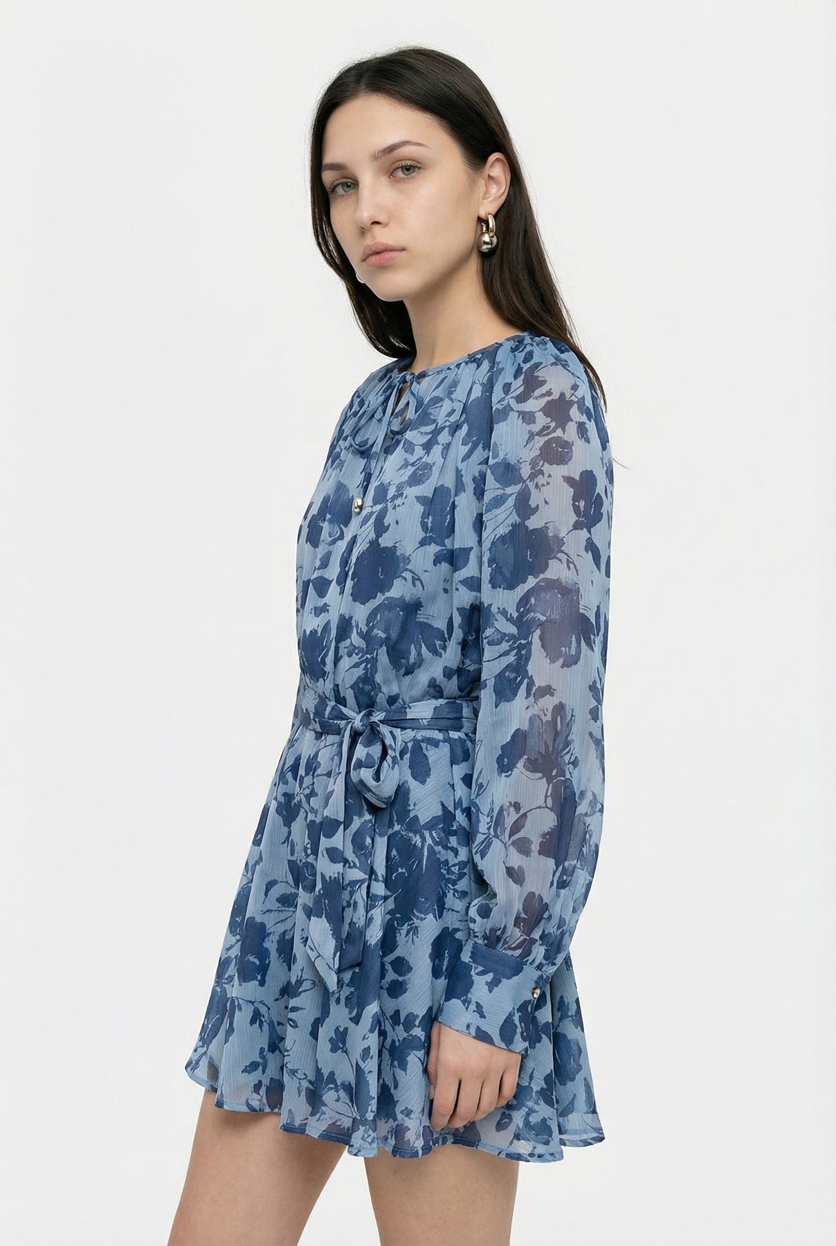 Yuvarlak yaka, ön kısmı bağlama detaylı, uzun kollu, belden kuşaklı, etek ucu hafif volanlı, sırtı tek düğme ve fermuar kapamalı, etek kısmı astarlı, üst kısmı çift kumaş, desenli mini elbise.