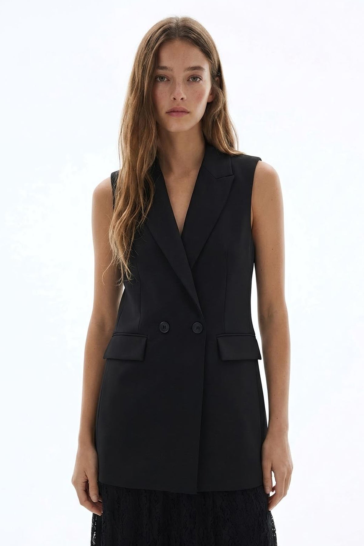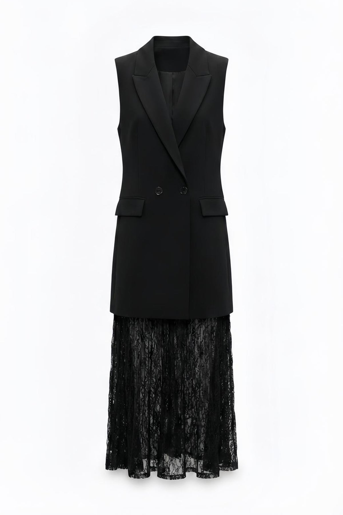 Astarsız, kruvaze yaka formda, kolsuz, çift düğme kapamalı, cep kapak detaylı, dantel etekli, yelek elbise.