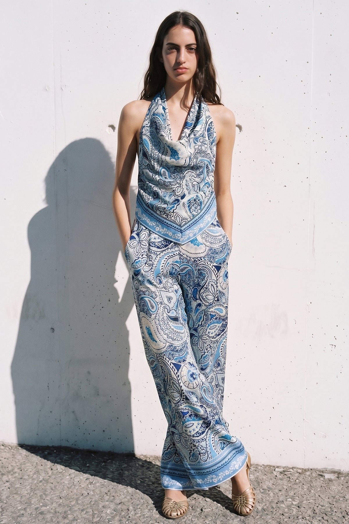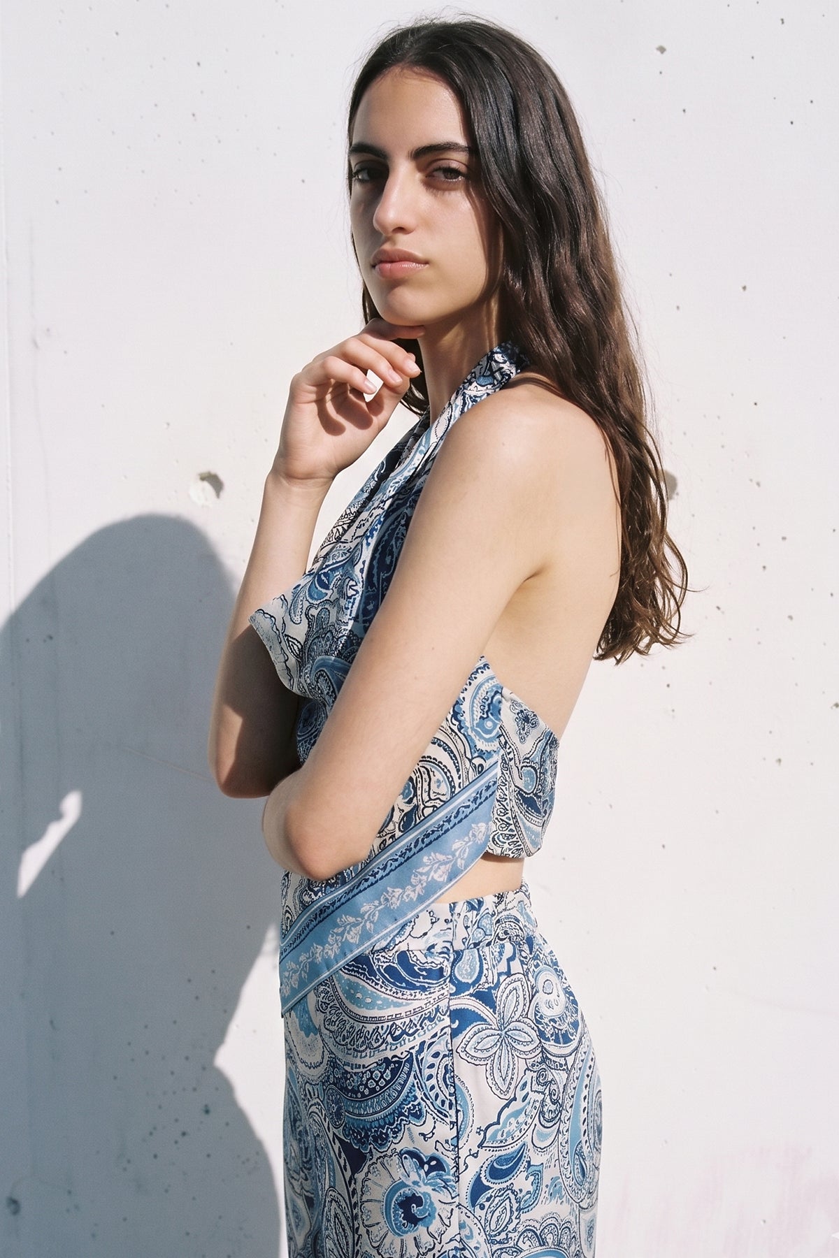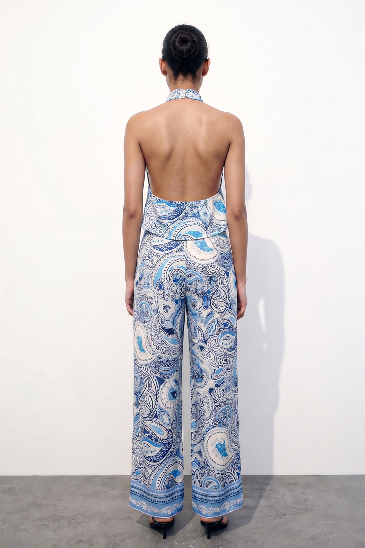 Şal desenli, degaje yaka, boyun kısmı düğme kapamalı, içi çift kat kumaşlı, sırtı lastikli, omuzları açık bluz.