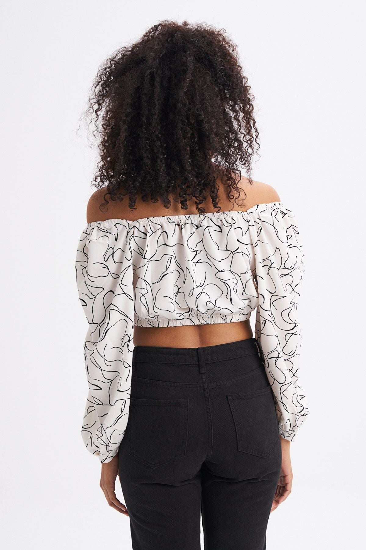 Patterned Tie Back Crop Blouse Ecru