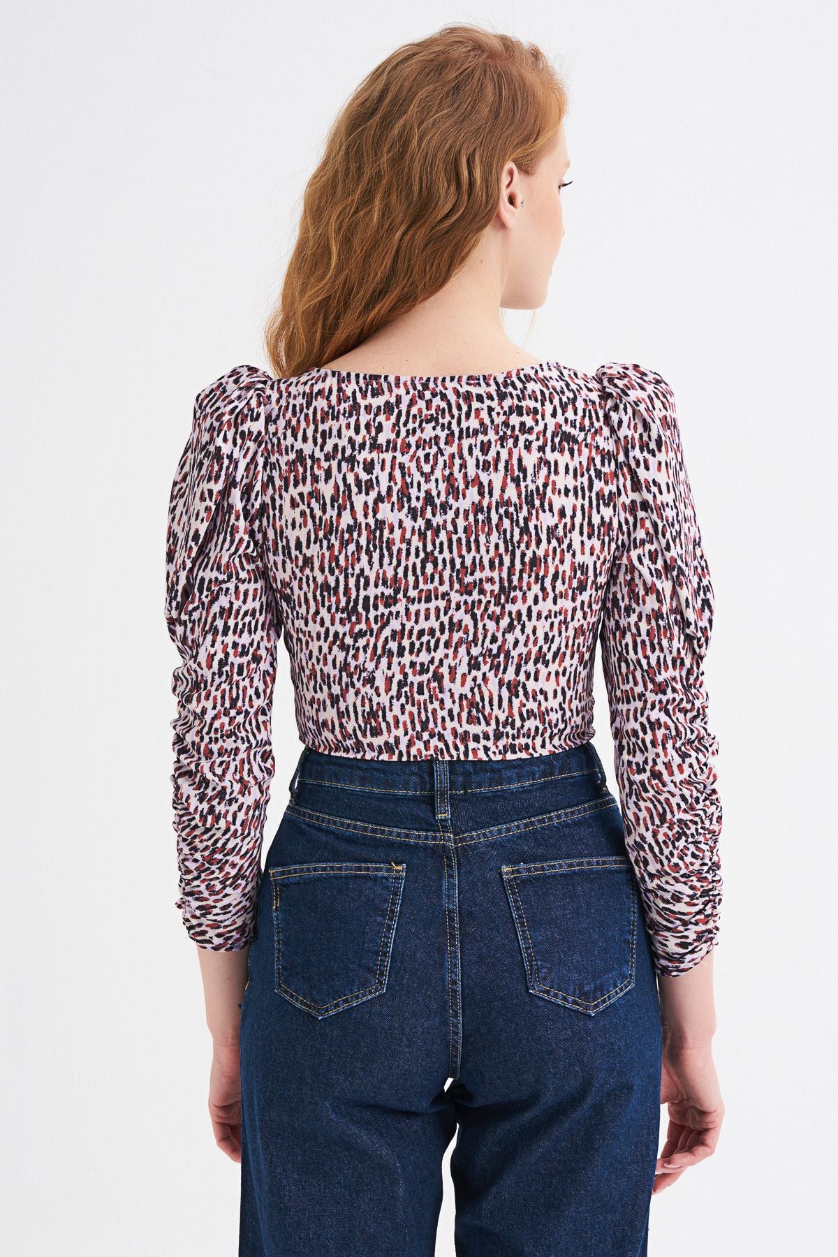 Patterned Front Buttoned Sleeves Gathered Blouse Lilac