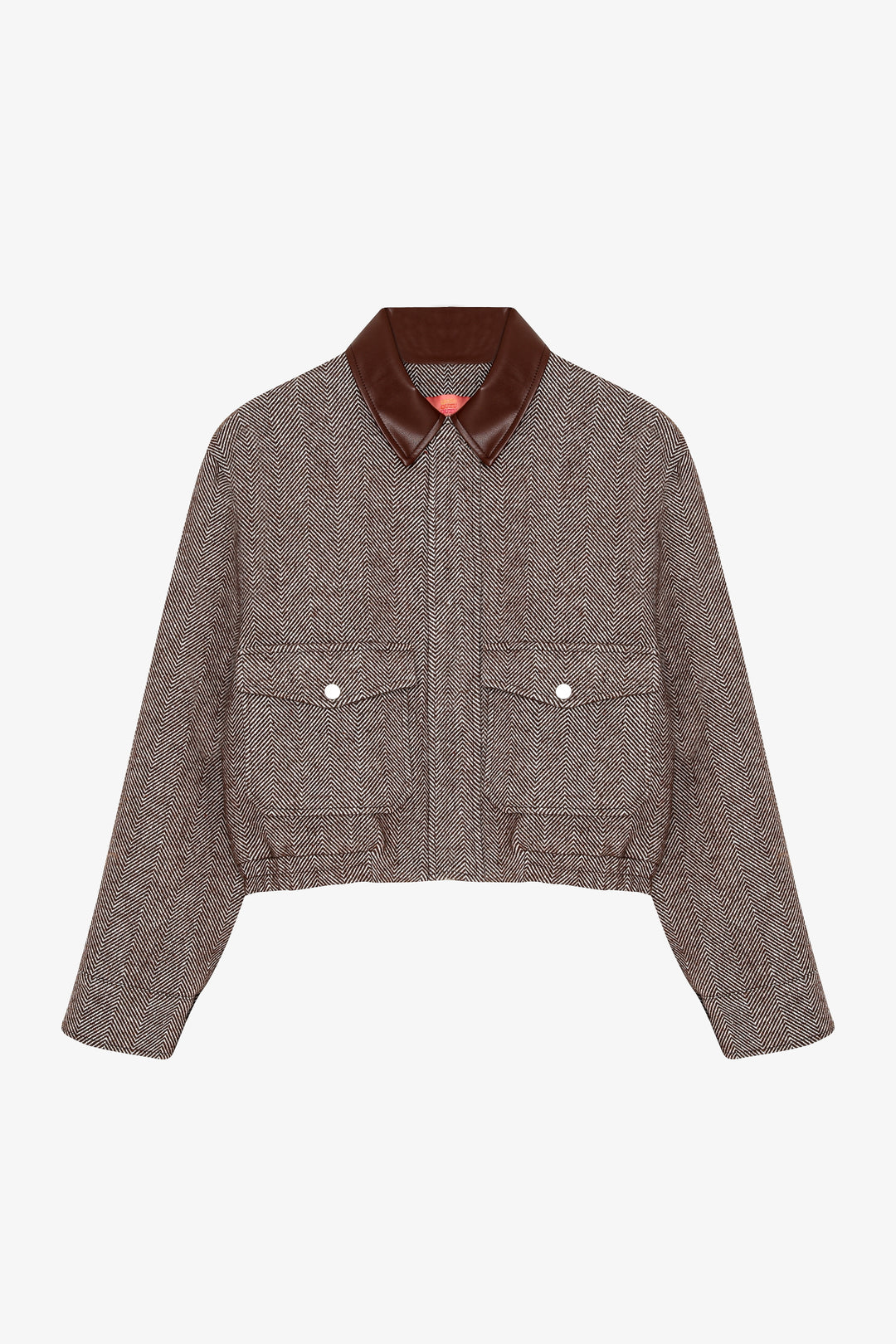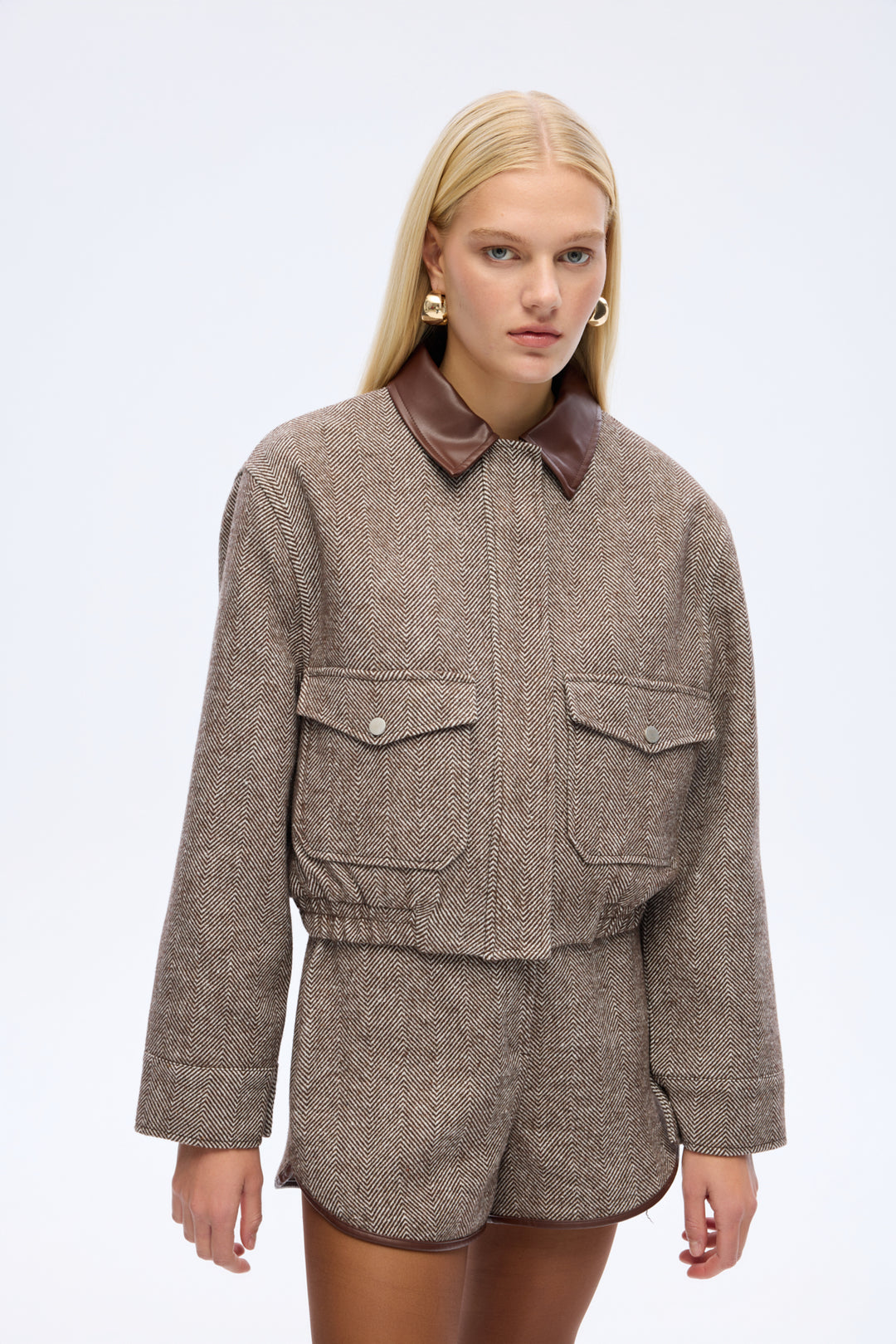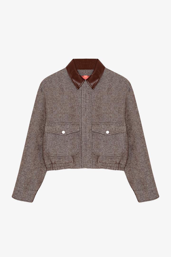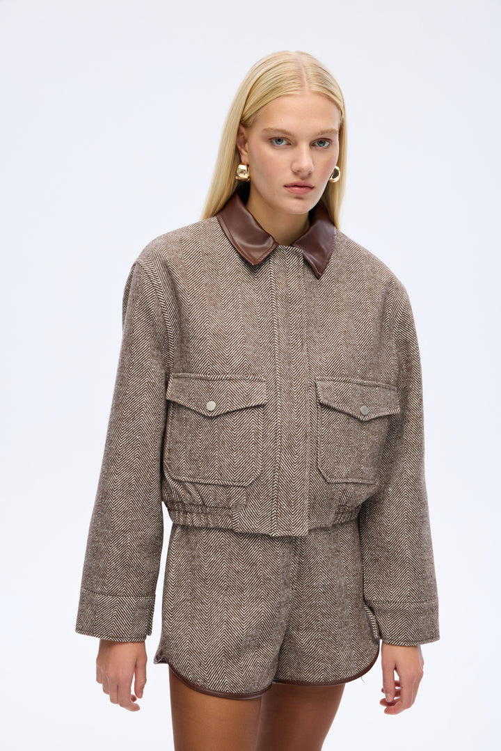 Kontrast suni deri yaka detaylı, uzun kollu, çift cepli, balıksırtı desenli, içi astarlı, fermuarlı ve gizli çıtçıt kapamalı, beli lastikli, kısa boy kaşe ceket.