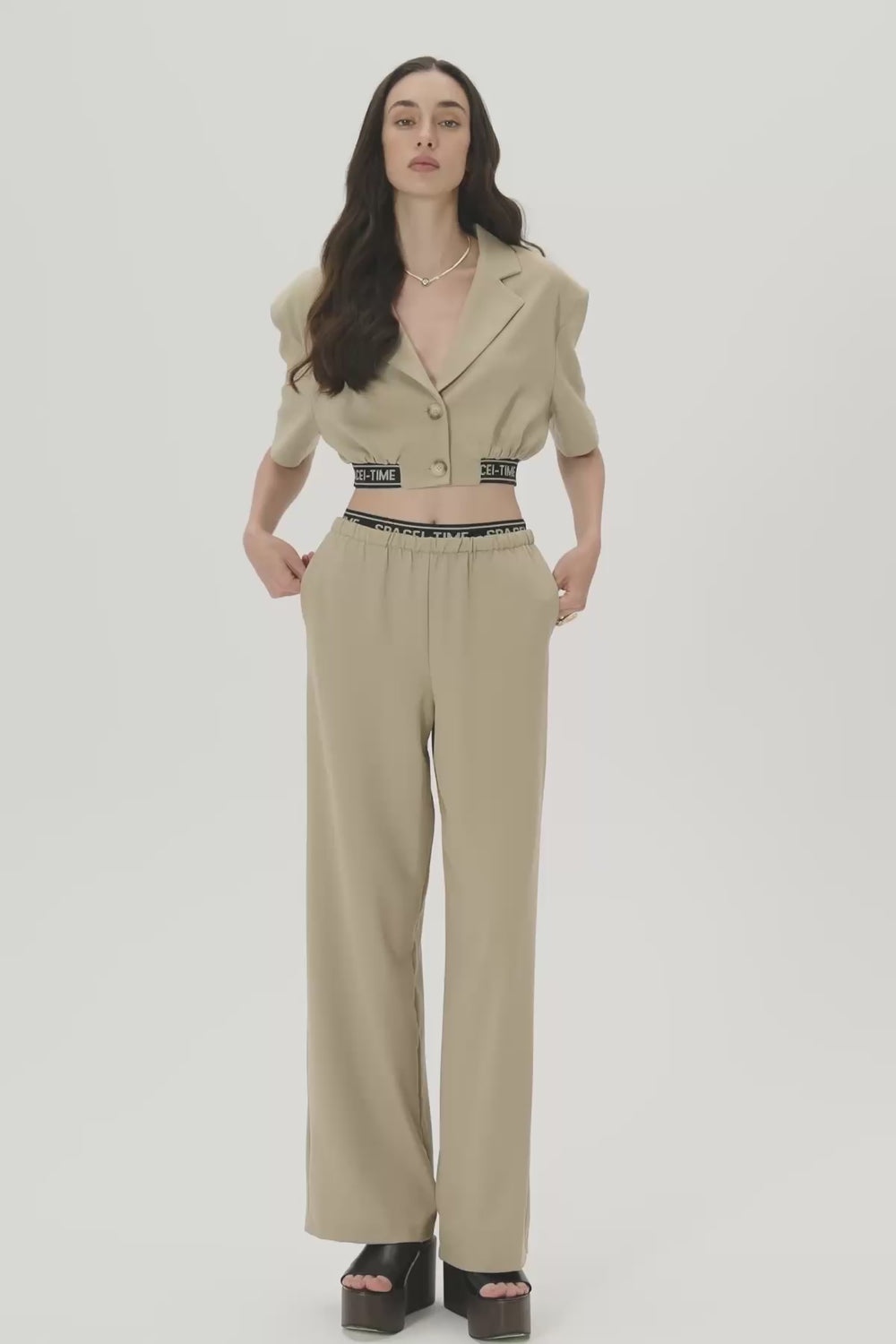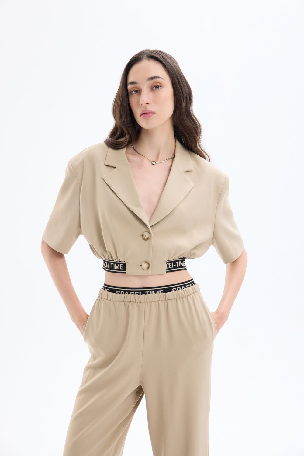 Beli Yazılı Kruvaze Yaka Düğmeli Kısa Ceket Bej