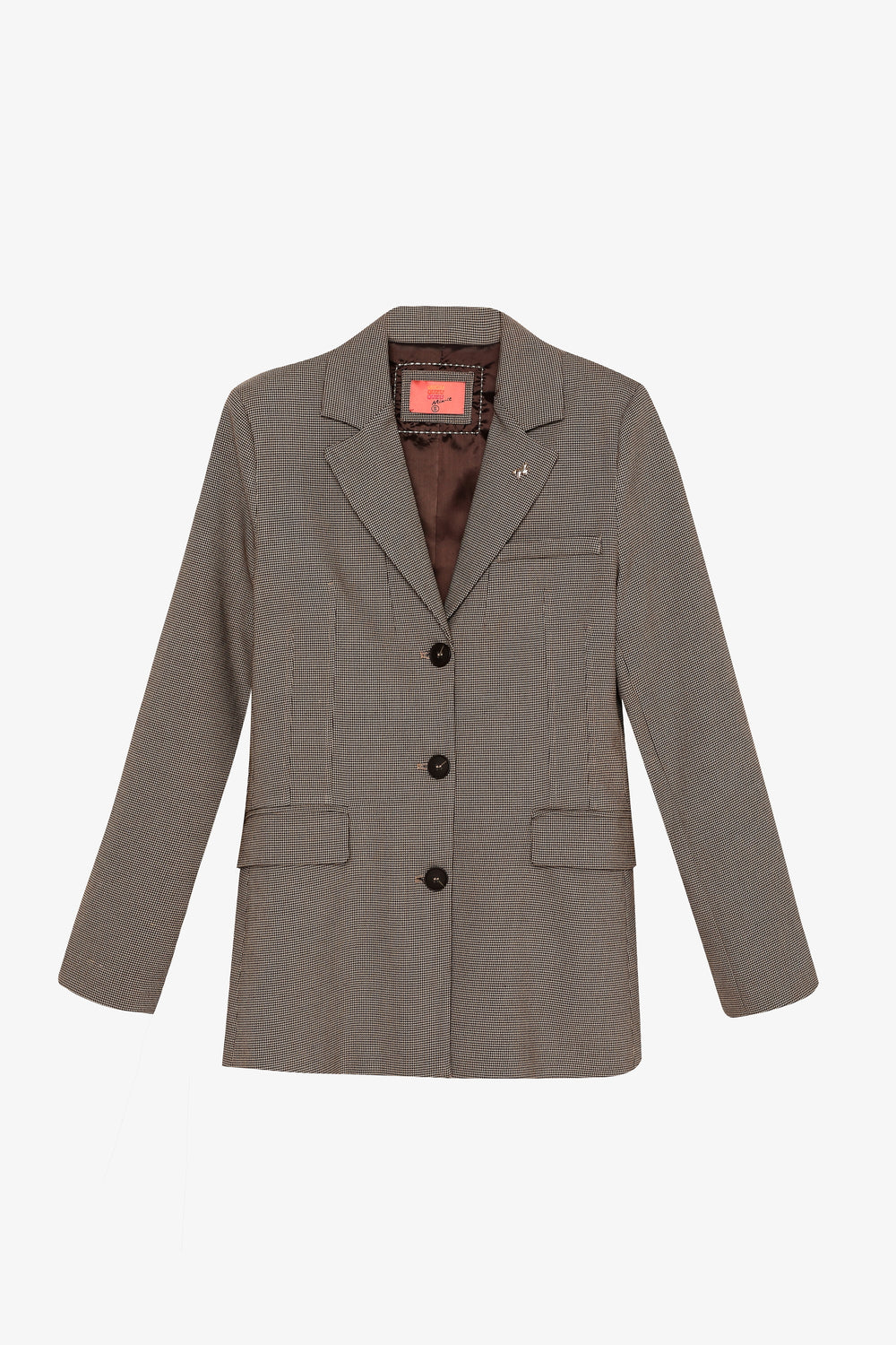 Broş Aksesuarlı Ekoseli Blazer Ceket Kahverengi