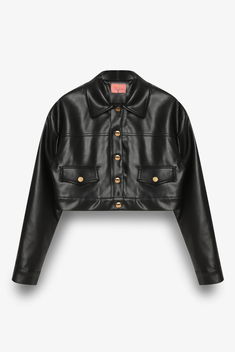İçi kendi renginden astarlı, metal düğme kapamalı, cep kapaklı, cepsiz, uzun kollu, crop boy suni deri ceket.