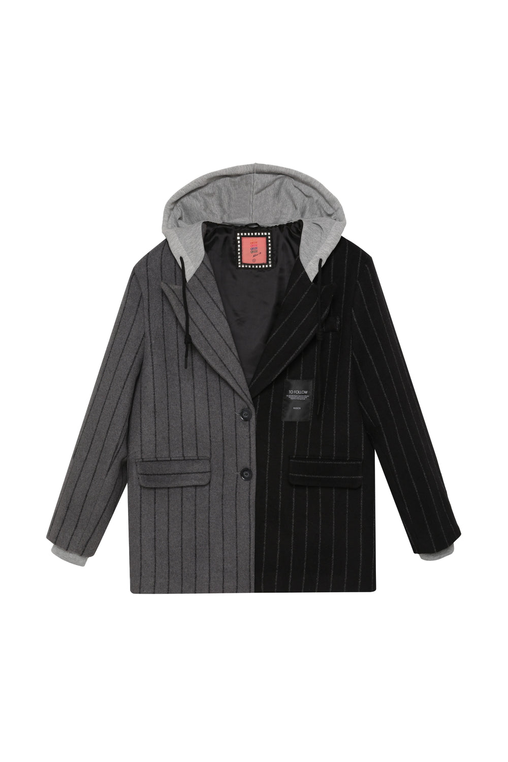 İki renk bloklu, kapüşonlu ip detaylı, çift cepli, önü etiket baskılı, içi astarlı, sırtı taş aksesuar baskılı, çizgili blazer ceket.