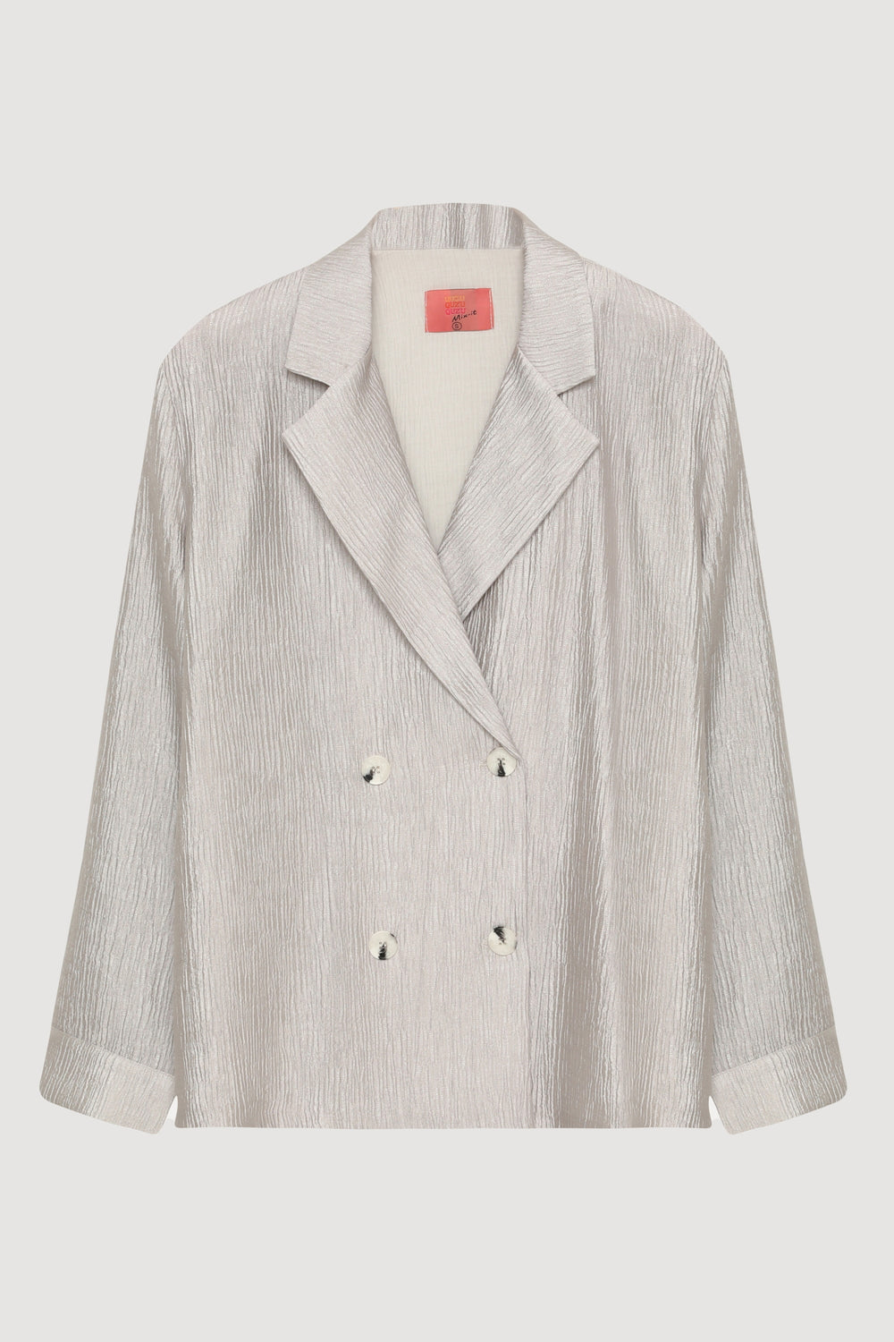 Kruvaze yaka, düğme kapamalı, parlak dokulu kumaştan üretilmiş, uzun kollu, modern görünümlü blazer ceket.