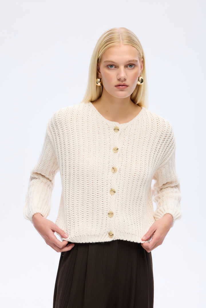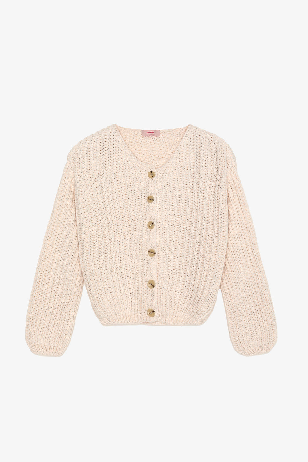 Bisiklet yaka, düğme kapama detaylı, uzun kollu, kalın örgü desenli kısa boy triko hırka.