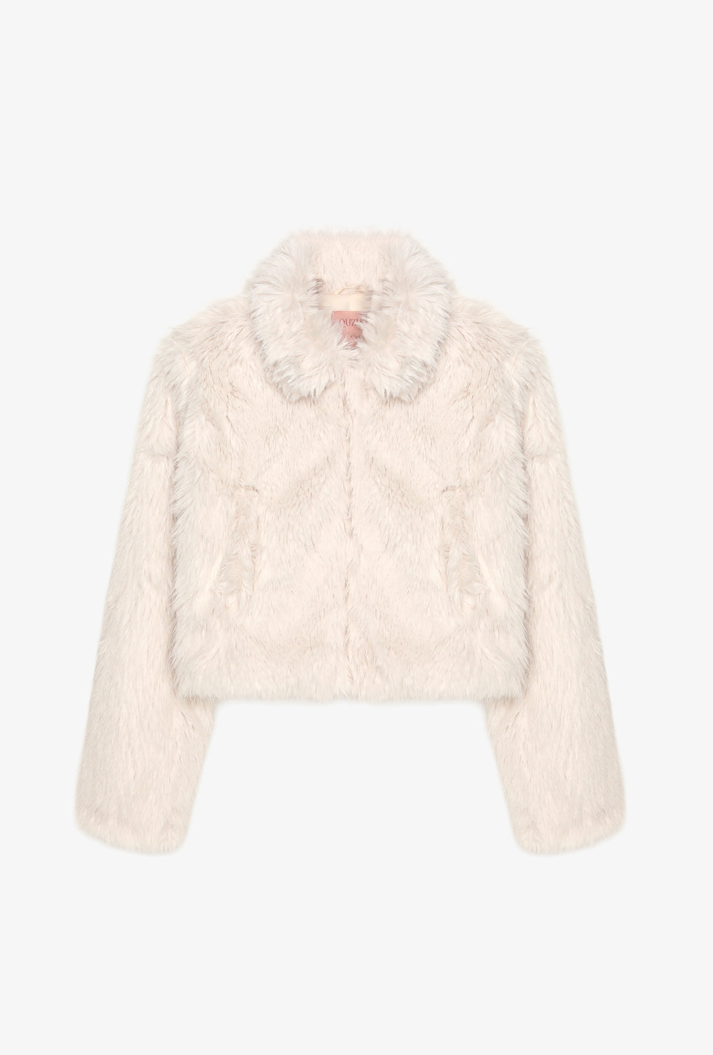 İçi astarlı, uzun kollu, suni kürk görünümlü, yumuşak dokulu, yandan cepli, önü fermuar kapamalı, kısa kürk ceket.