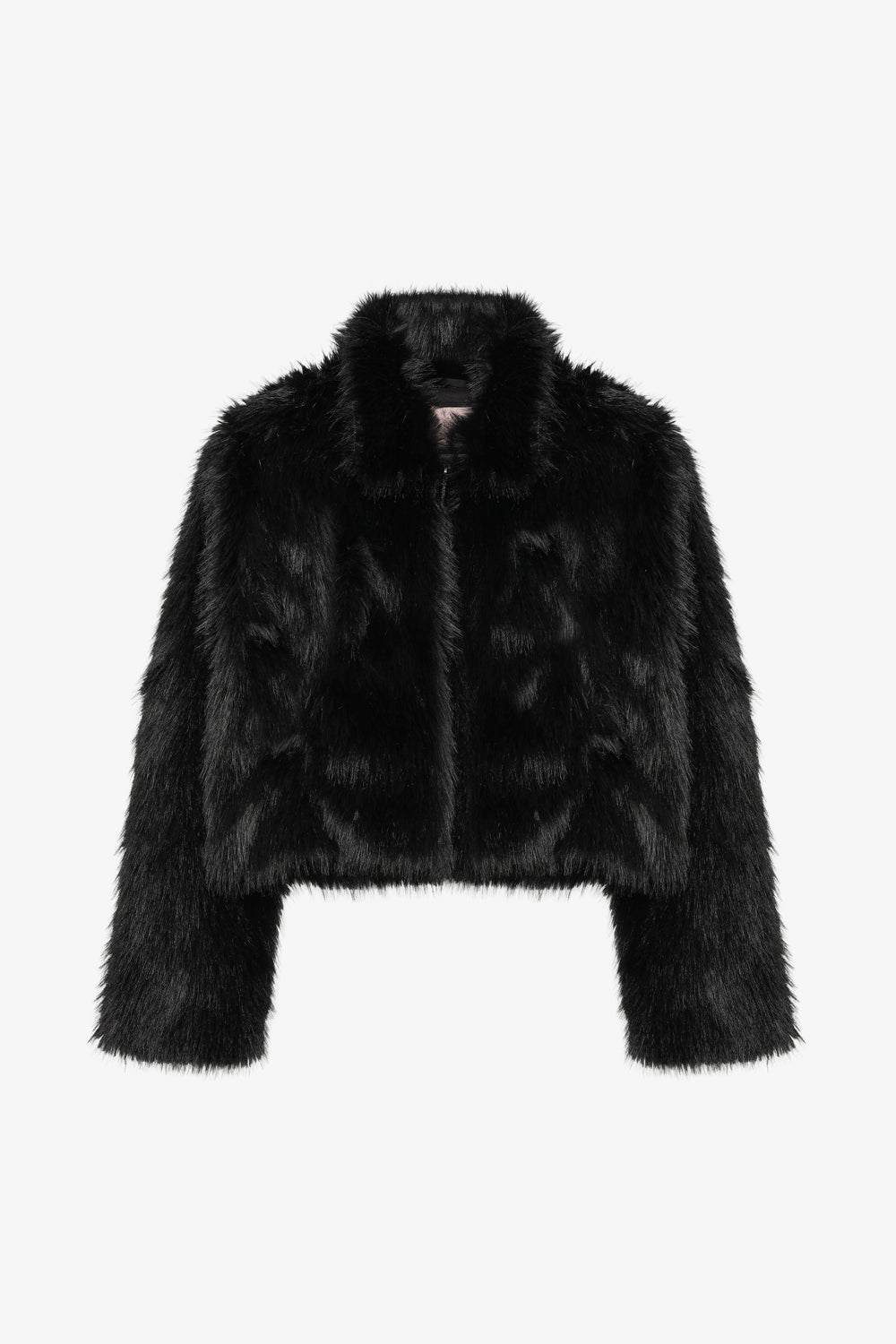 İçi astarlı, uzun kollu, suni kürk görünümlü, yumuşak dokulu, yandan cepli, önü fermuar kapamalı, kısa kürk ceket.