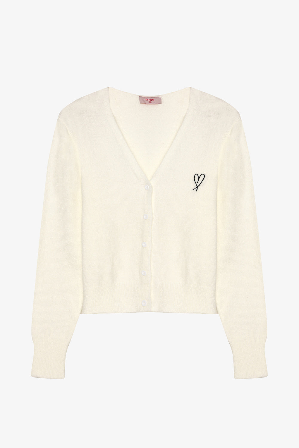 Uzun kollu, V yaka, ön kısmı düğme kapamalı, göğüs üzerinde küçük kalp nakış detaylı, triko hırka.