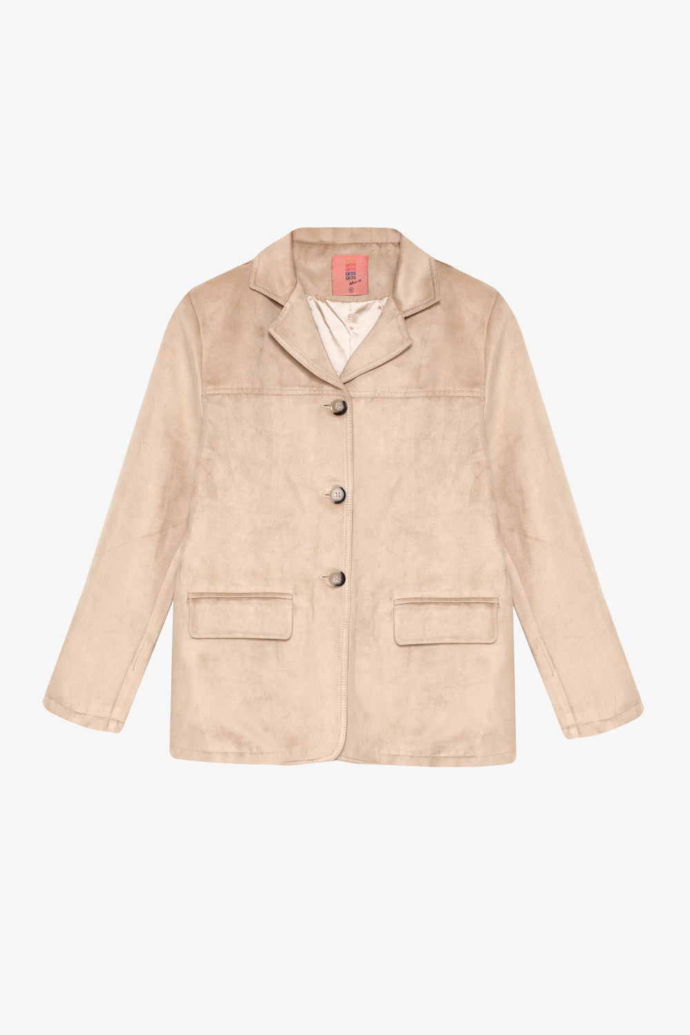 İçi kendi renginden astarlı, yumuşak dokulu süet görünümlü kumaştan, klasik yaka detaylı, uzun kollu, cep kapaklı, düğme kapamalı blazer ceket.