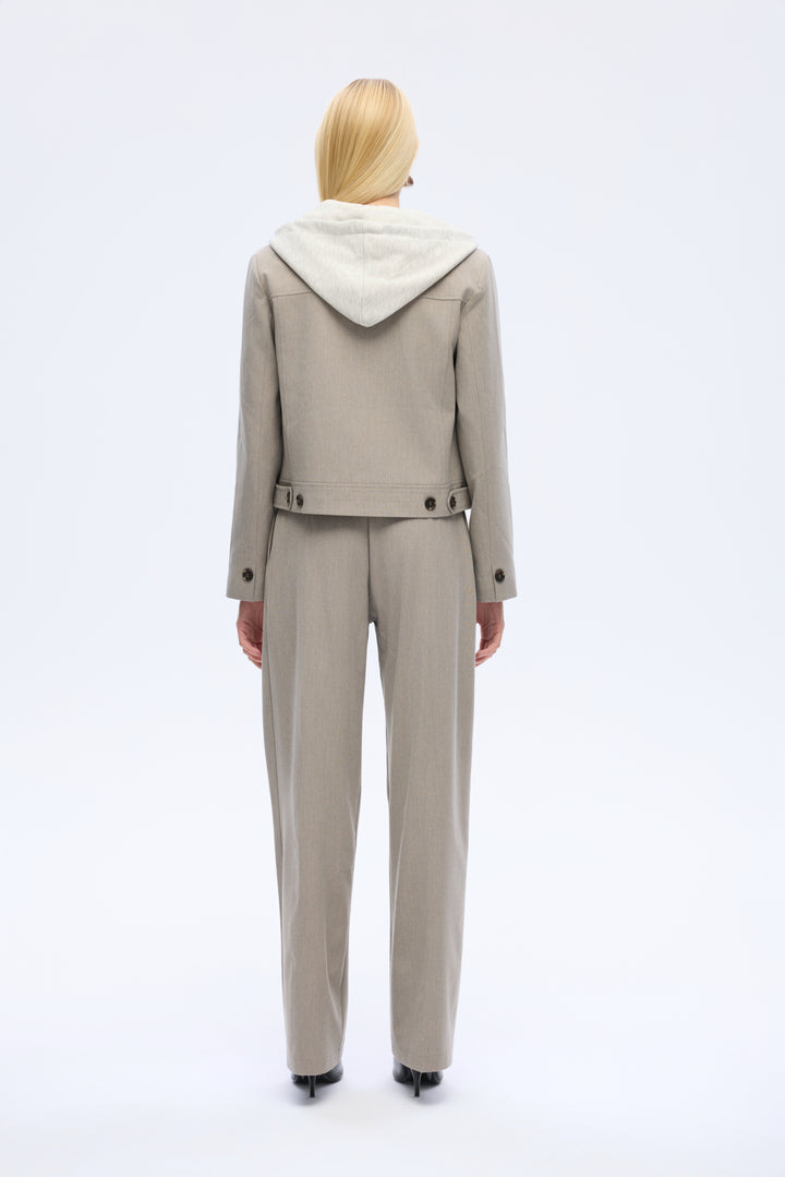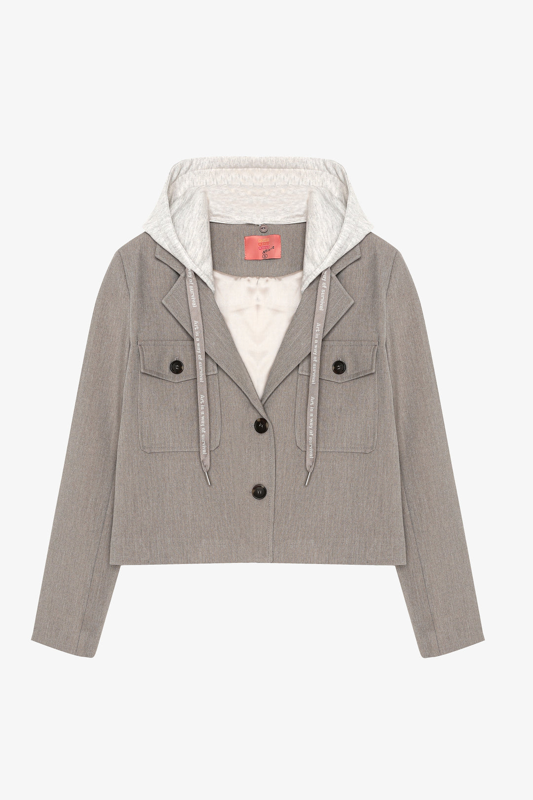 İçi astarlı, uzun kollu, çıkarılabilir kapüşonlu, garni yazı bağlama detaylı, düğmeli cepli, düğme kapamalı, kısa boy ceket.