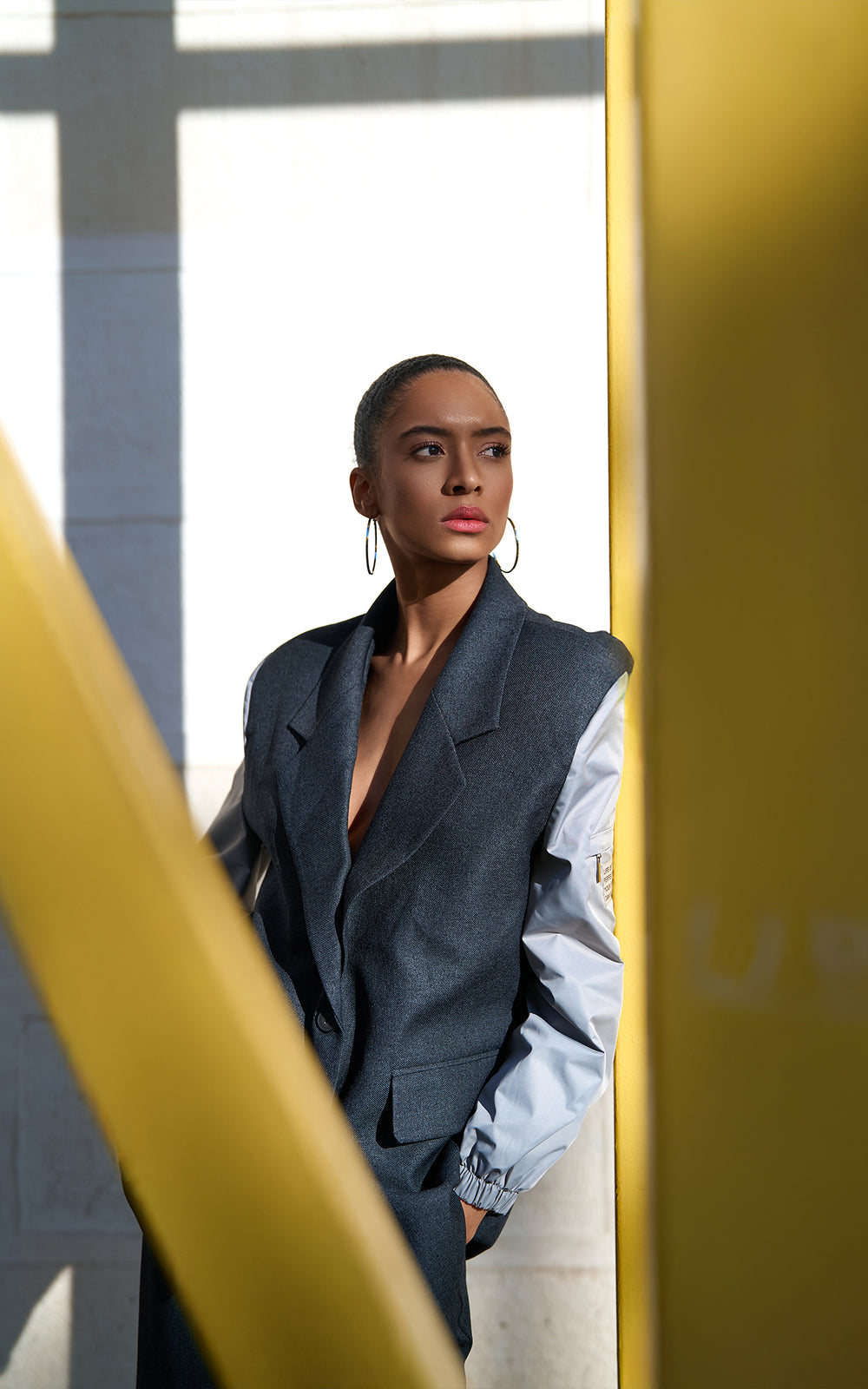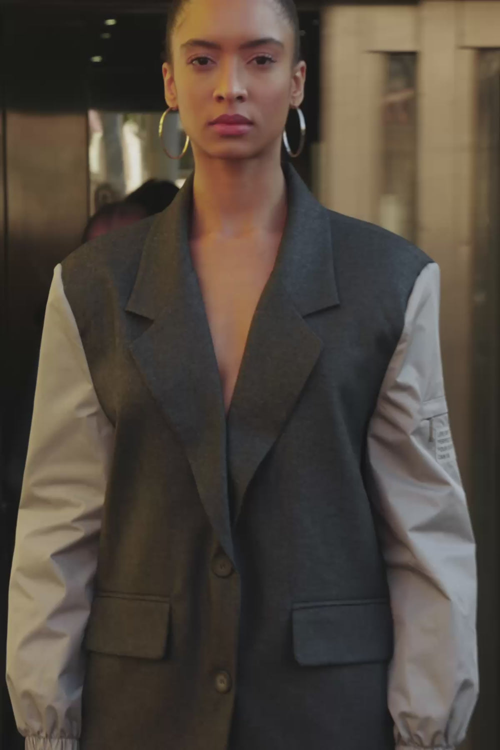 İçi astarlı, kolları teknik kumaş detaylı, uzun kol, cepli, kolu fermuar detaylı, kruvaze yaka, oversize, düğmeli blazer ceket.