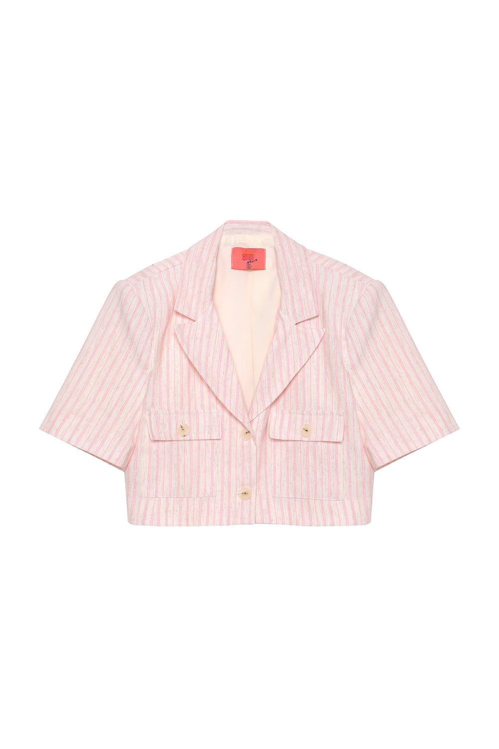 Kruvaze yaka, kısa kollu, cepli, önü düğmeli, crop ceket.