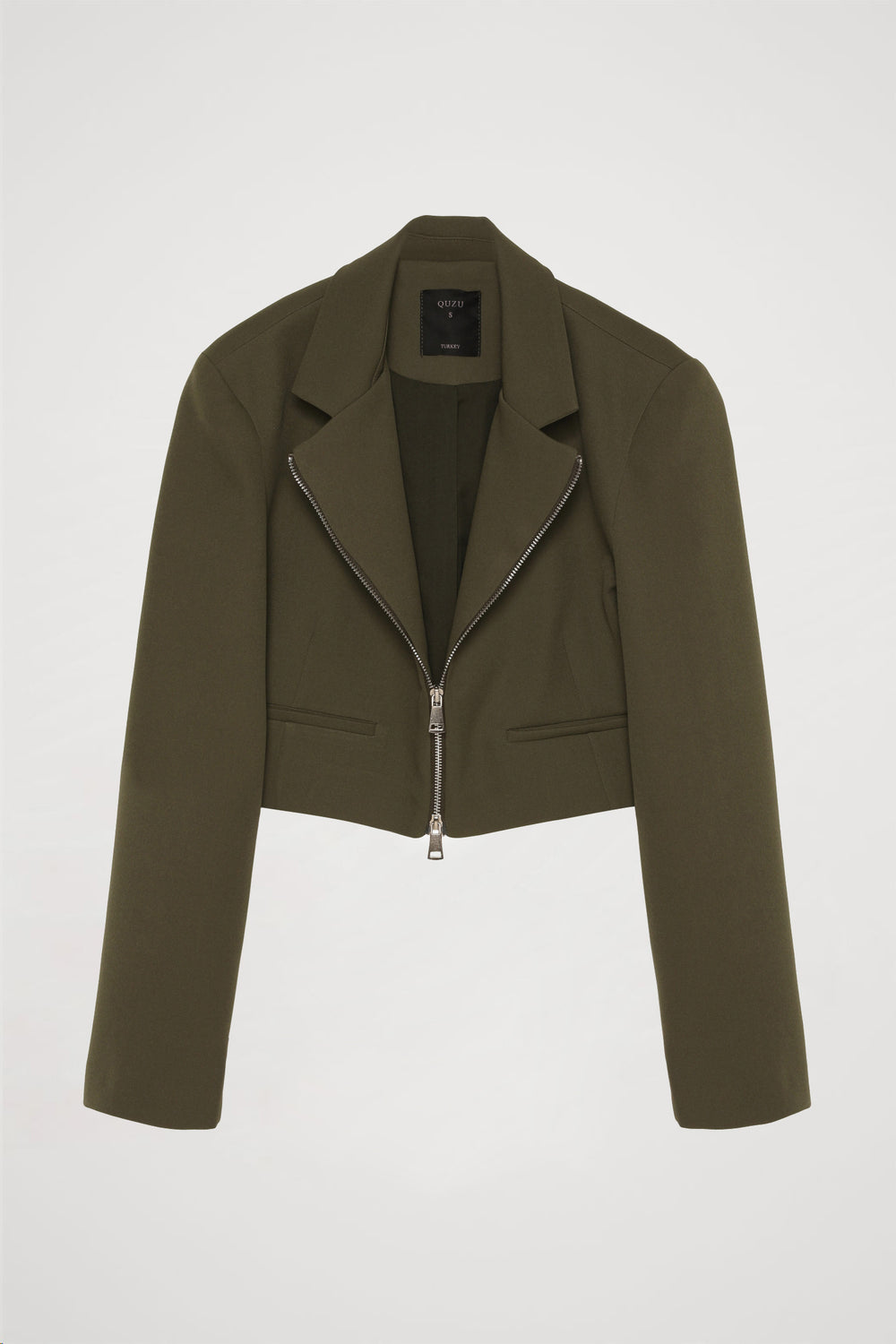 Önden Fermuarlı Crop Blazer Ceket Haki
