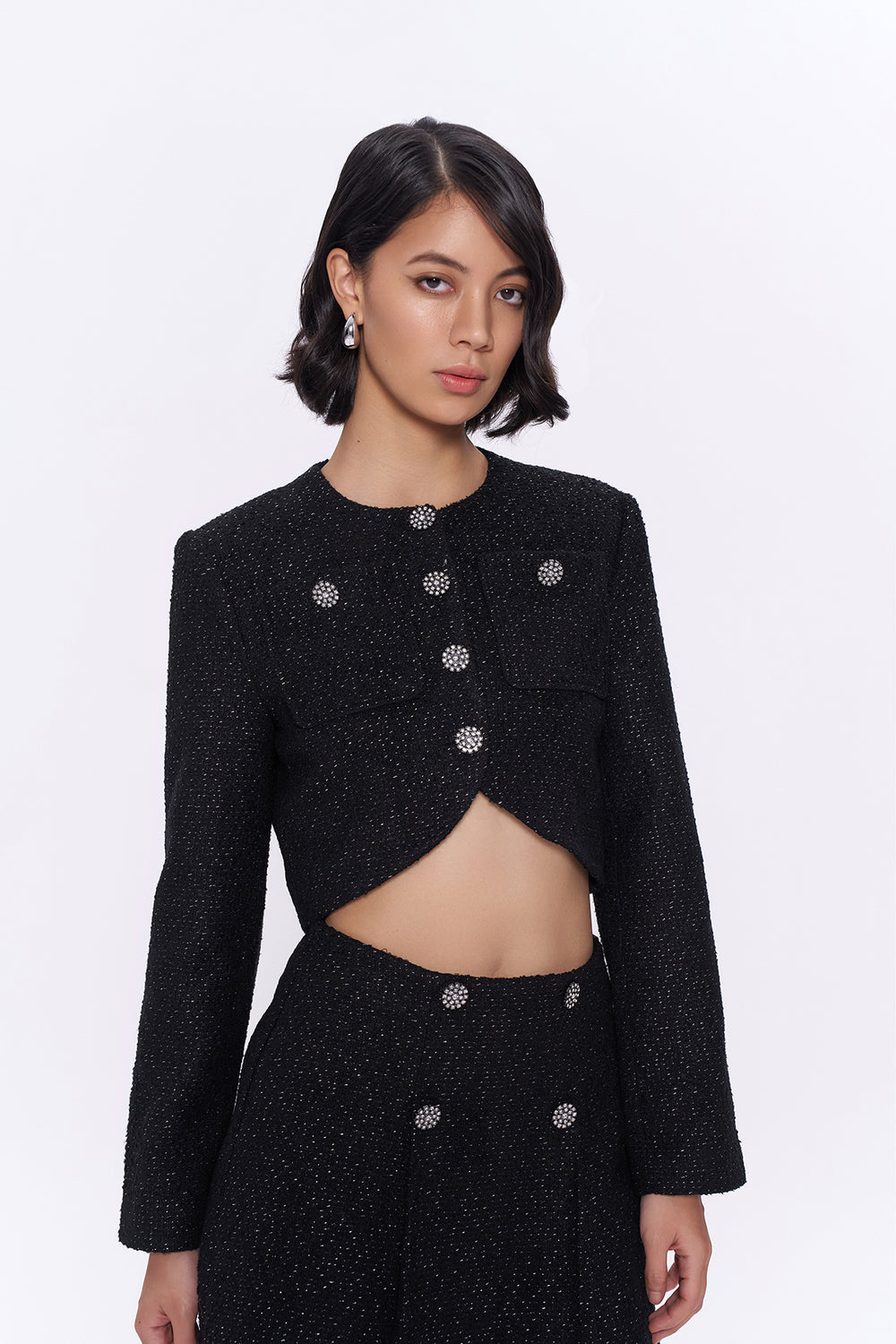 Parlak taş düğme detaylı, simli kumaş, içi astarlı, uzun kollu, tüvit crop ceket.