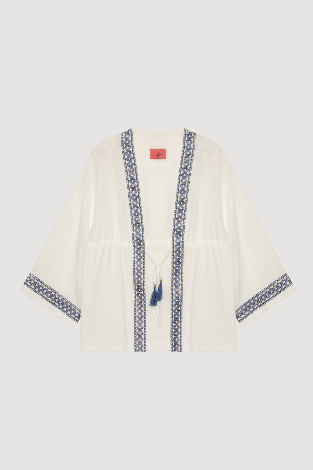Etnik desen nakış işlemeli şerit detaylı, beli lastikli püskü gold aksesuarl bağlamalı, yarım kollu, bol kesim, yakasız kimono.