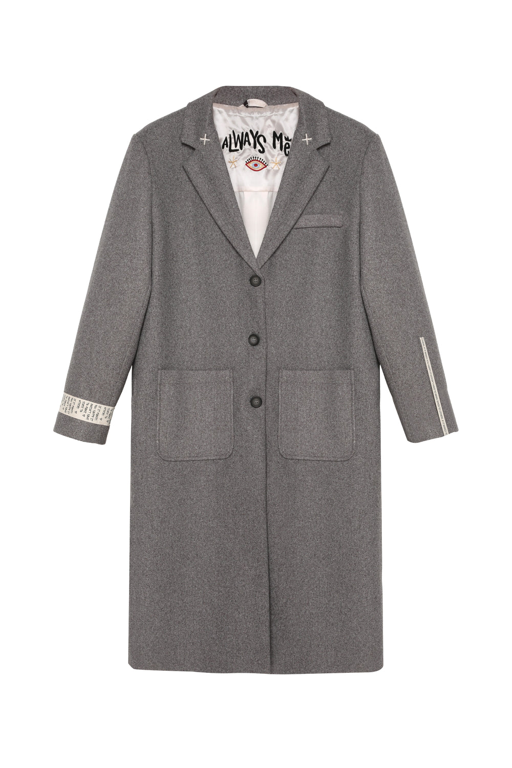 İçi yazı nakış astarlı, kruvaze yaka, düğme kapamalı, çift cepli, sırtı büyük etiket baskılı, kolları baskı detaylı, uzun kaban.