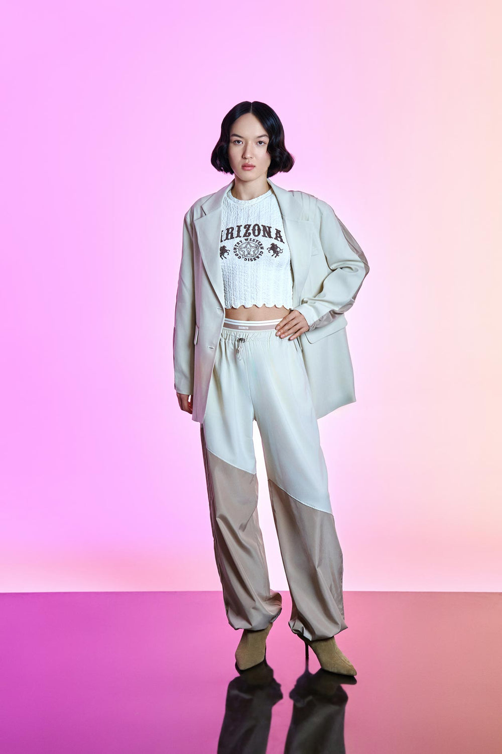 Sırtı kumaş matchli, içi astarlı, yaka detaylı, düğme kapamalı, çift cep kapaklı, kolları renk şeritli, beli ve kolu yarım lastik detaylı, "I keep secrets, by forgetting what yo told me almost immediately" yazı etiket baskılı, blazer ceket.