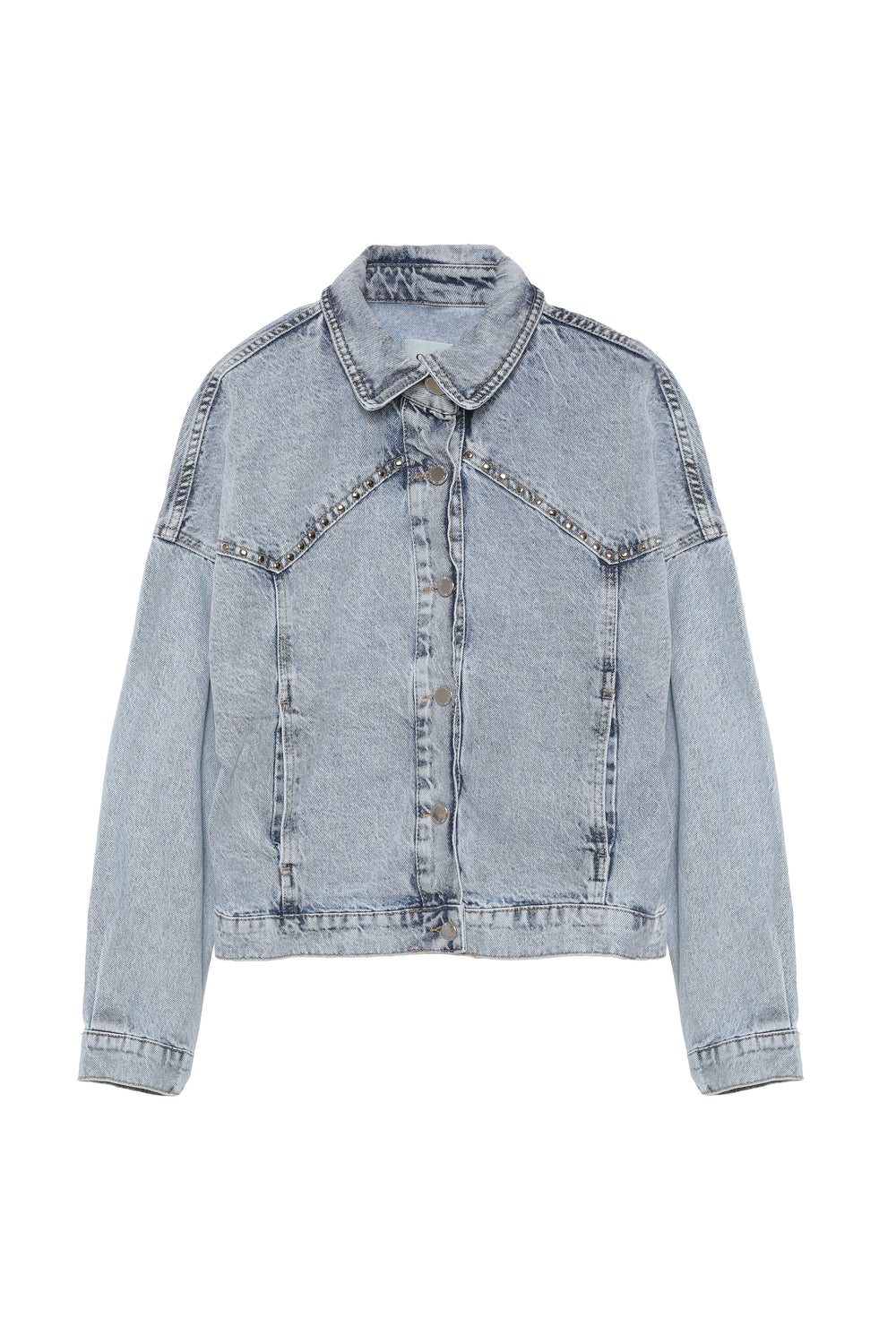 Uzun kollu, trok aksesuarlı, çift cepli, kot ceket.