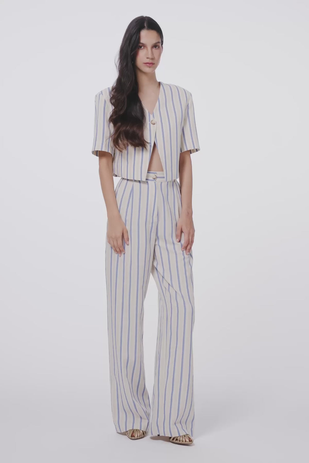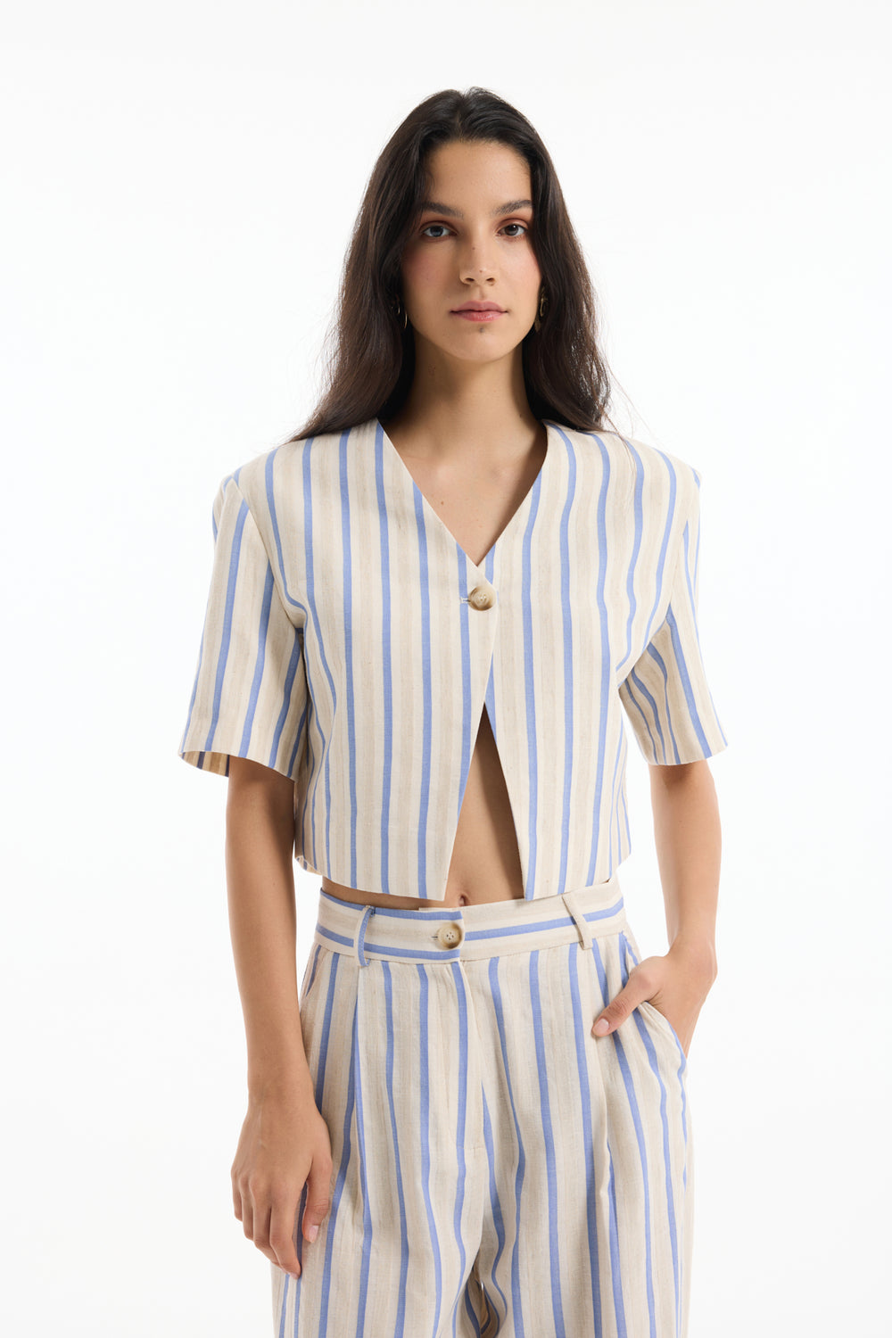 Tek Düğmeli Çizgili Kısa Kol Ceket Ekru
