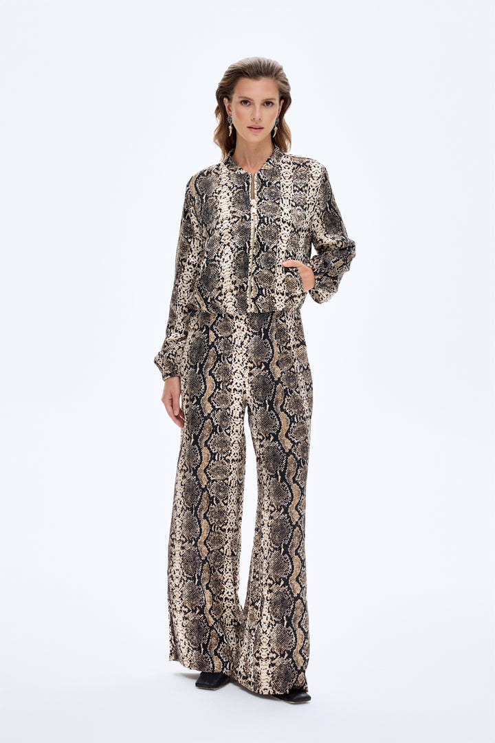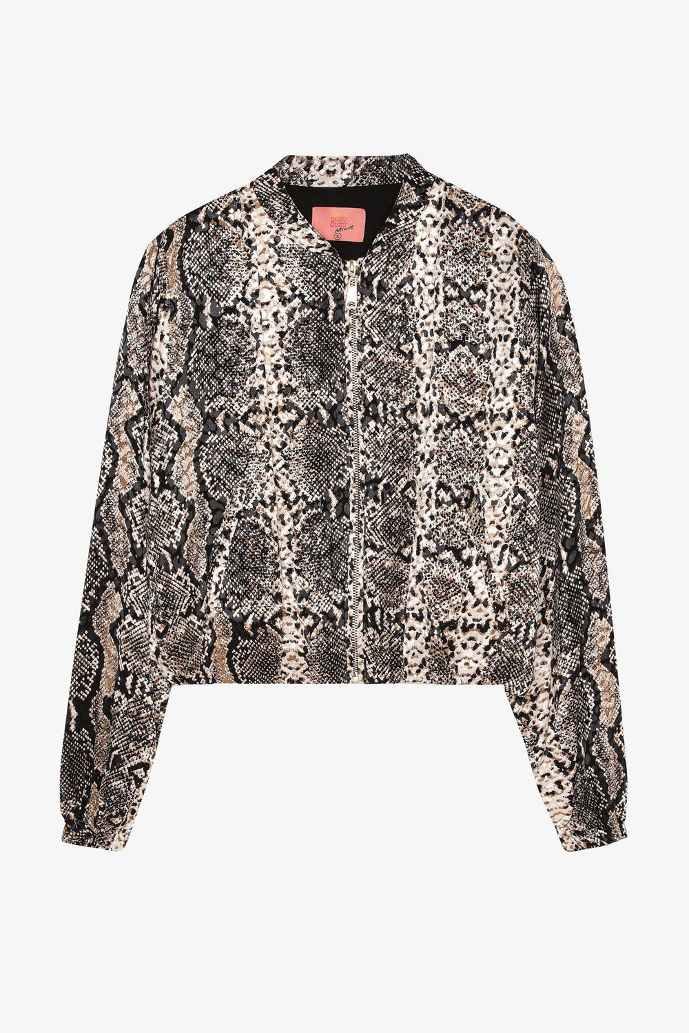 Önü fermuarlı, yılan desenli parlak kumaştan, uzun kollu, lastik manşetli, içi astarlı, yan cepli, kısa ceket.