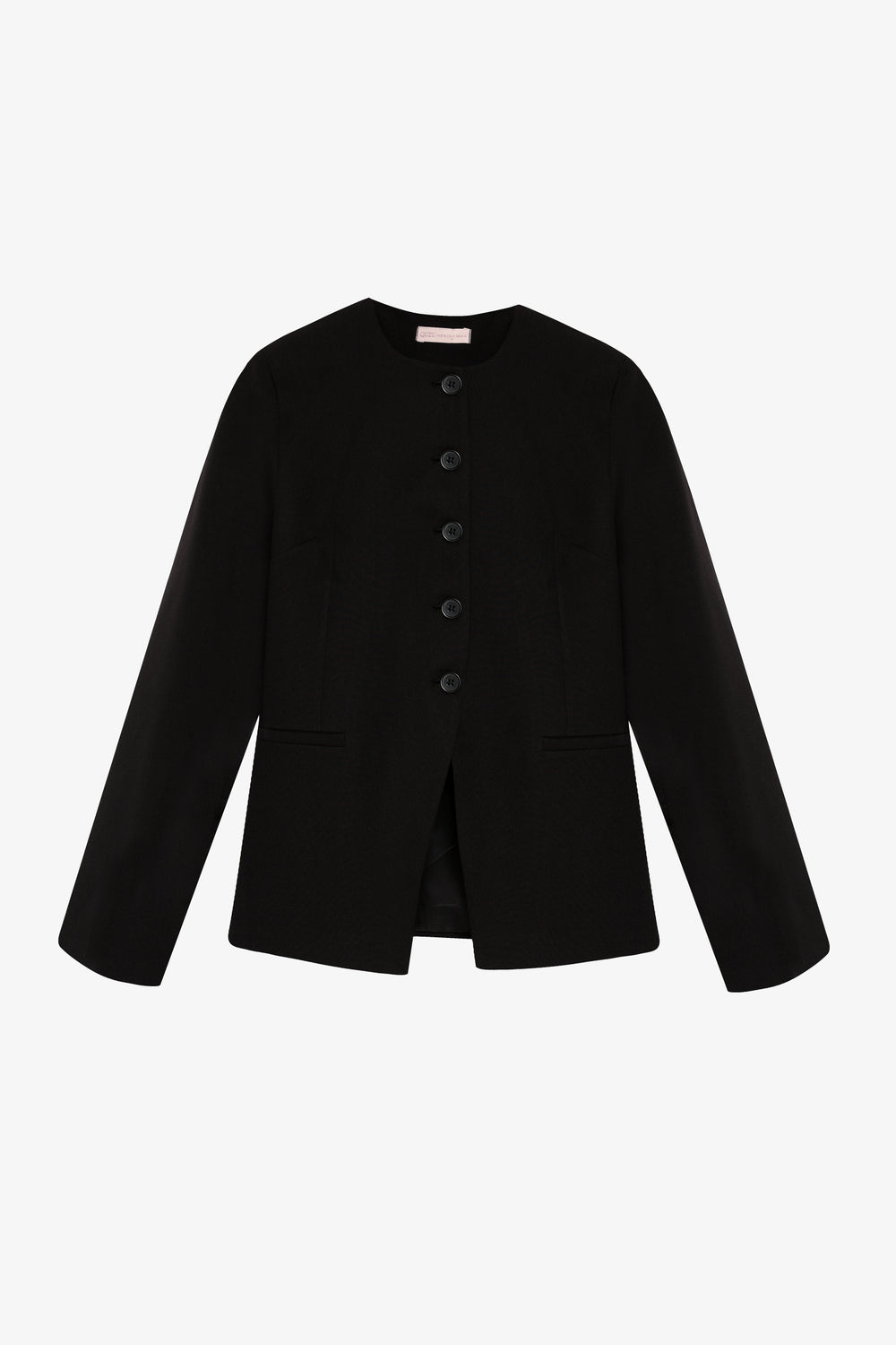 Yuvarlak yaka, önü düğme kapamalı, vücuda oturan formda, uzun kollu, içi astarlı, önden yırtmaç görünümde, kısa ceket.