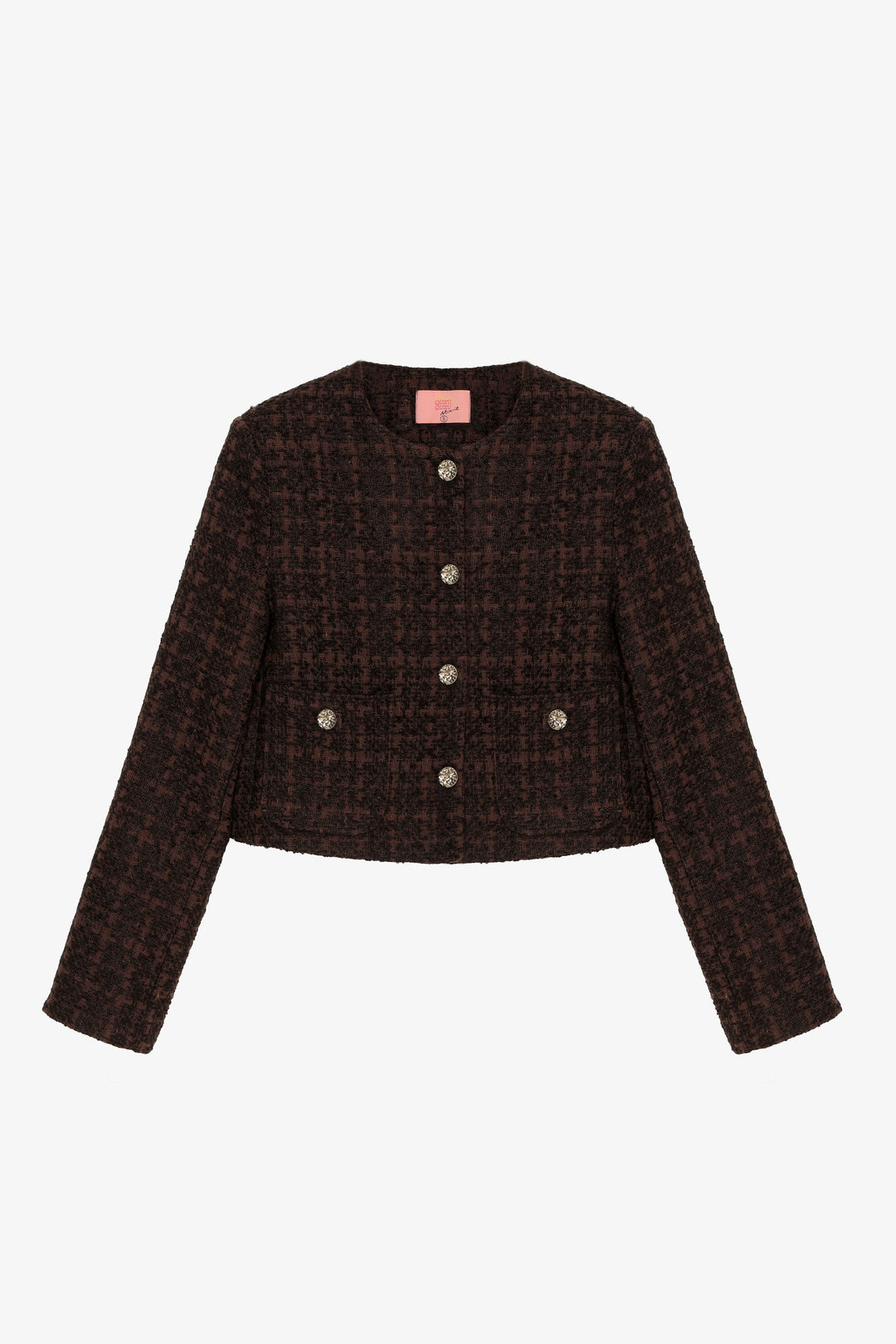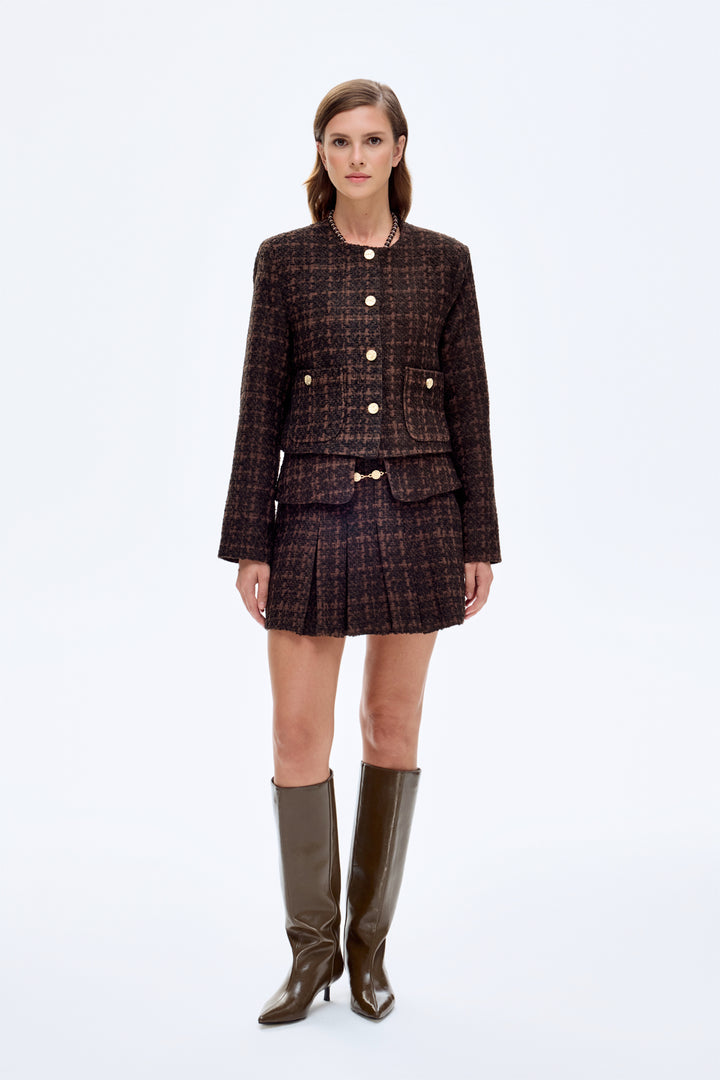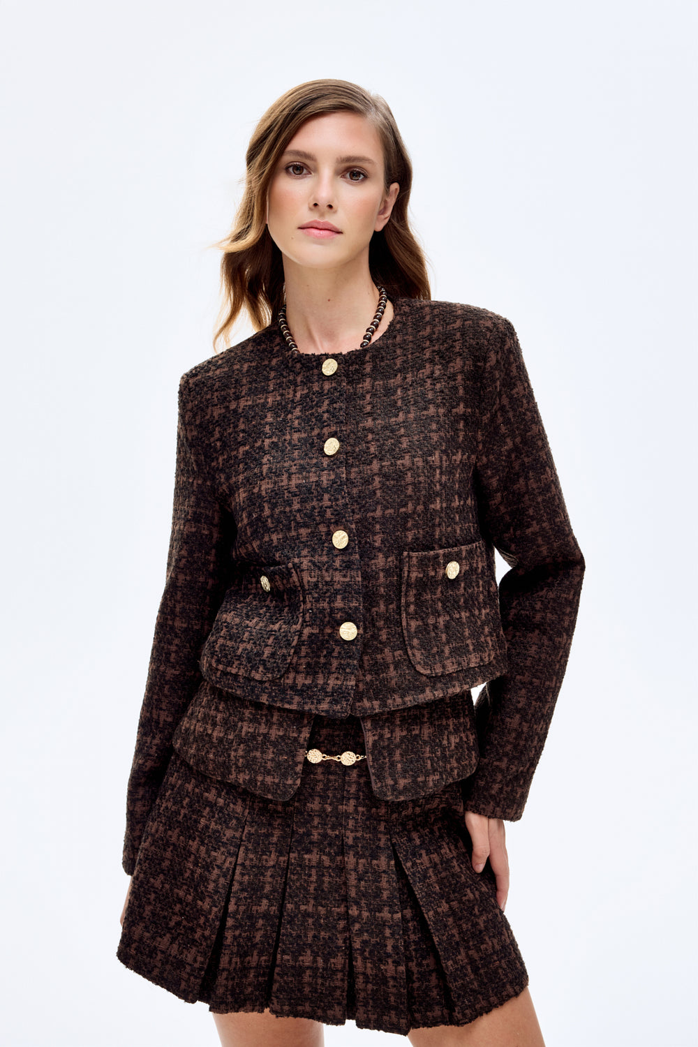 Yuvarlak Yaka Gold Düğmeli Tüvit Ceket Kahverengi