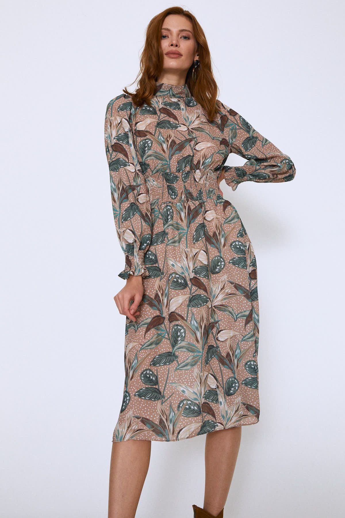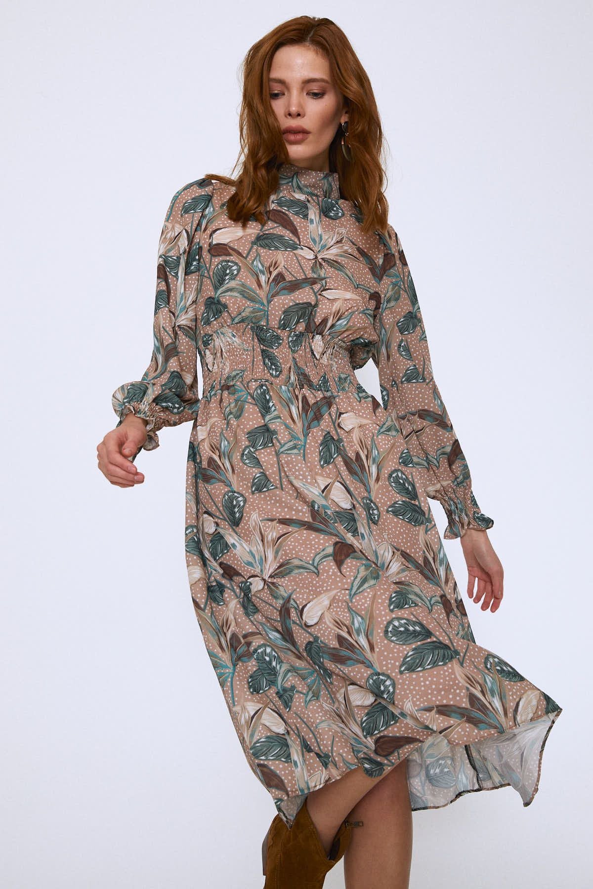 Floral Pattern Dress Camel