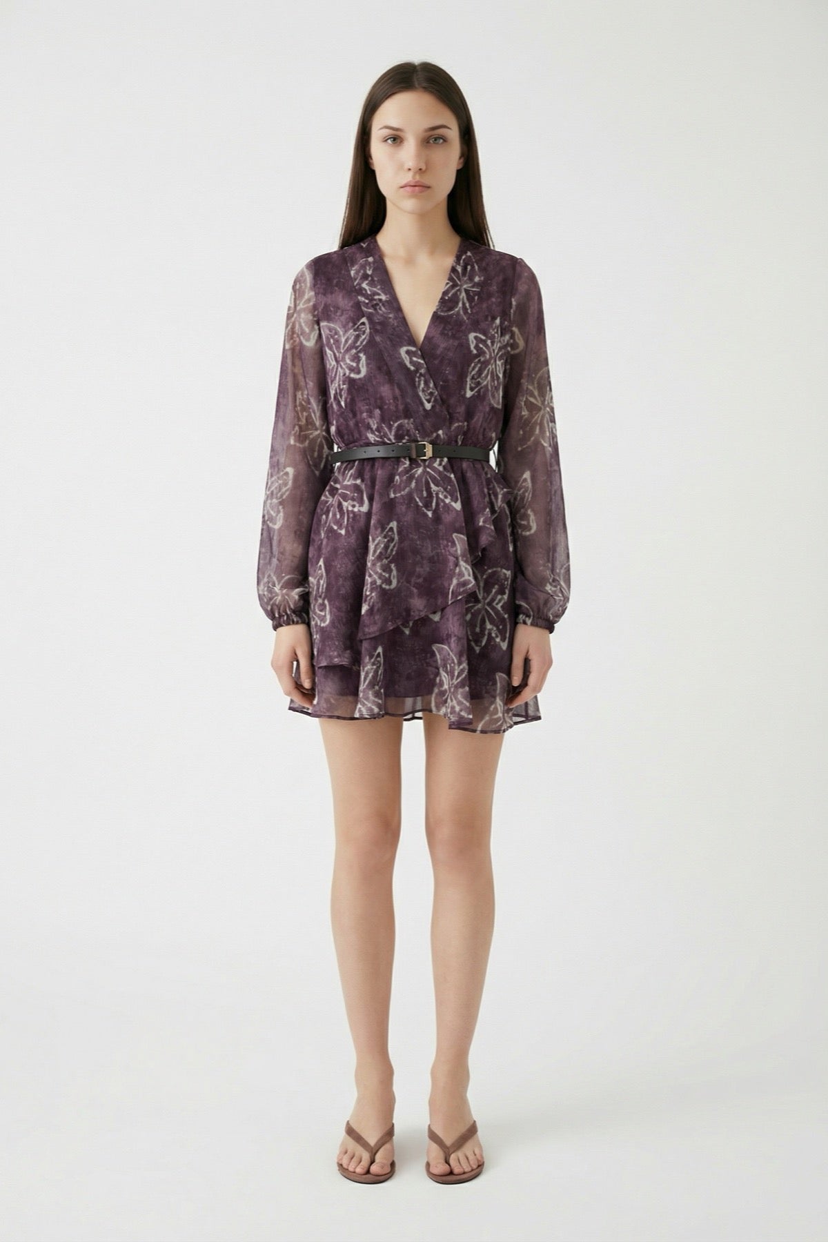 İçi kendi renginden astarlı, v yaka, çiçek desenli, uzun kollu, manşetleri lastikli, belden kemer detaylı, katlı volanlı, mini şifon elbise.