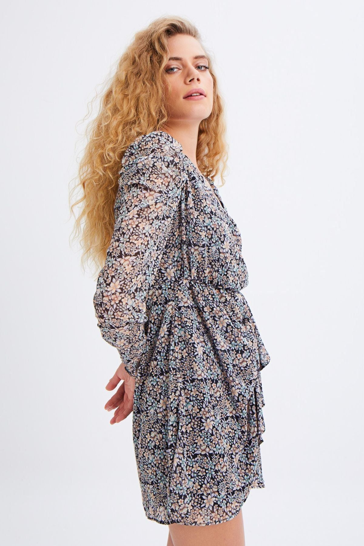 Crispy Floral Patterned Ruffle Double Breasted Mini Dress Black