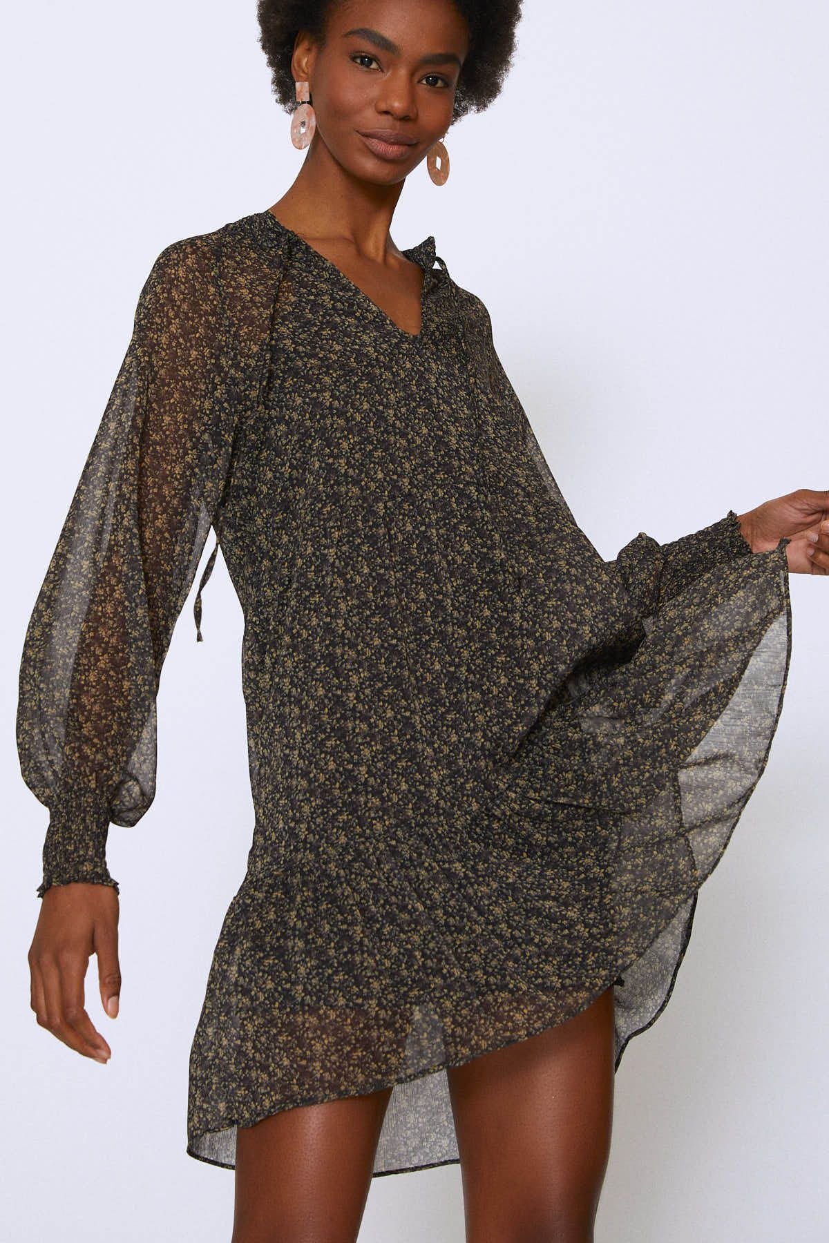 Floral patterns added to the fluency of chiffon increase the pleasure of wearing a dress. Emphasizing the importance of details with its tie-down collar, your dress is waiting for you with all its comfort.