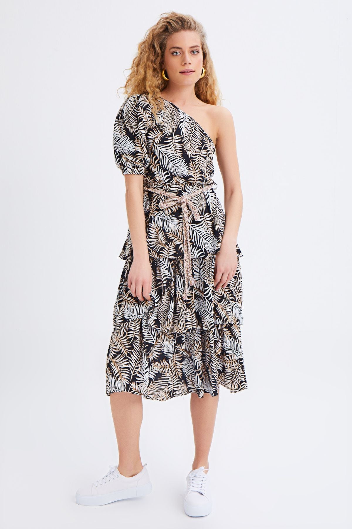 Viscose dress that does not fit into the standards, has a modern pattern and has a lively look with straw belt detail. It is ready to be an indispensable symbol of the beauty and comfort of summer.