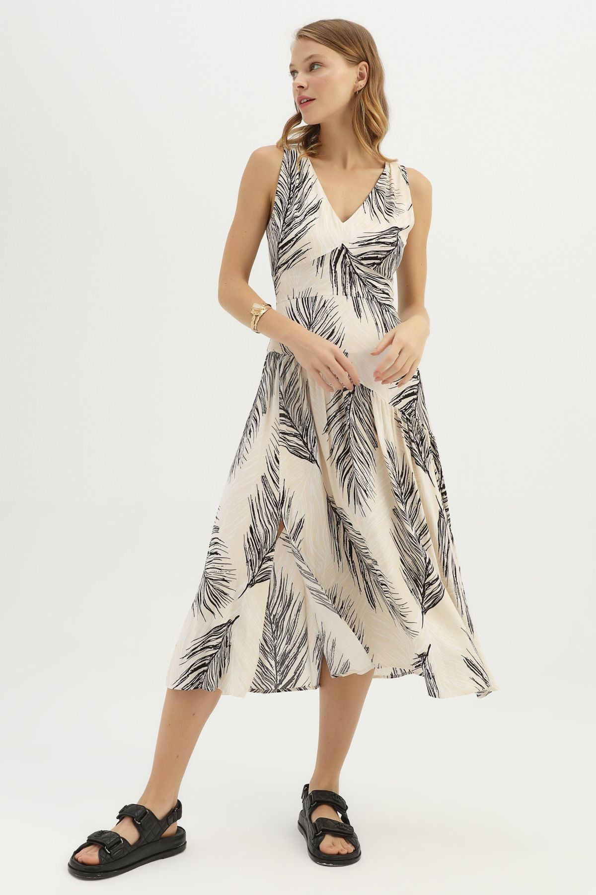 Patterned V-Neck Slit Dress Beige