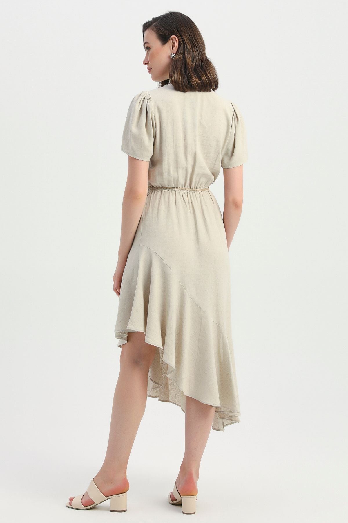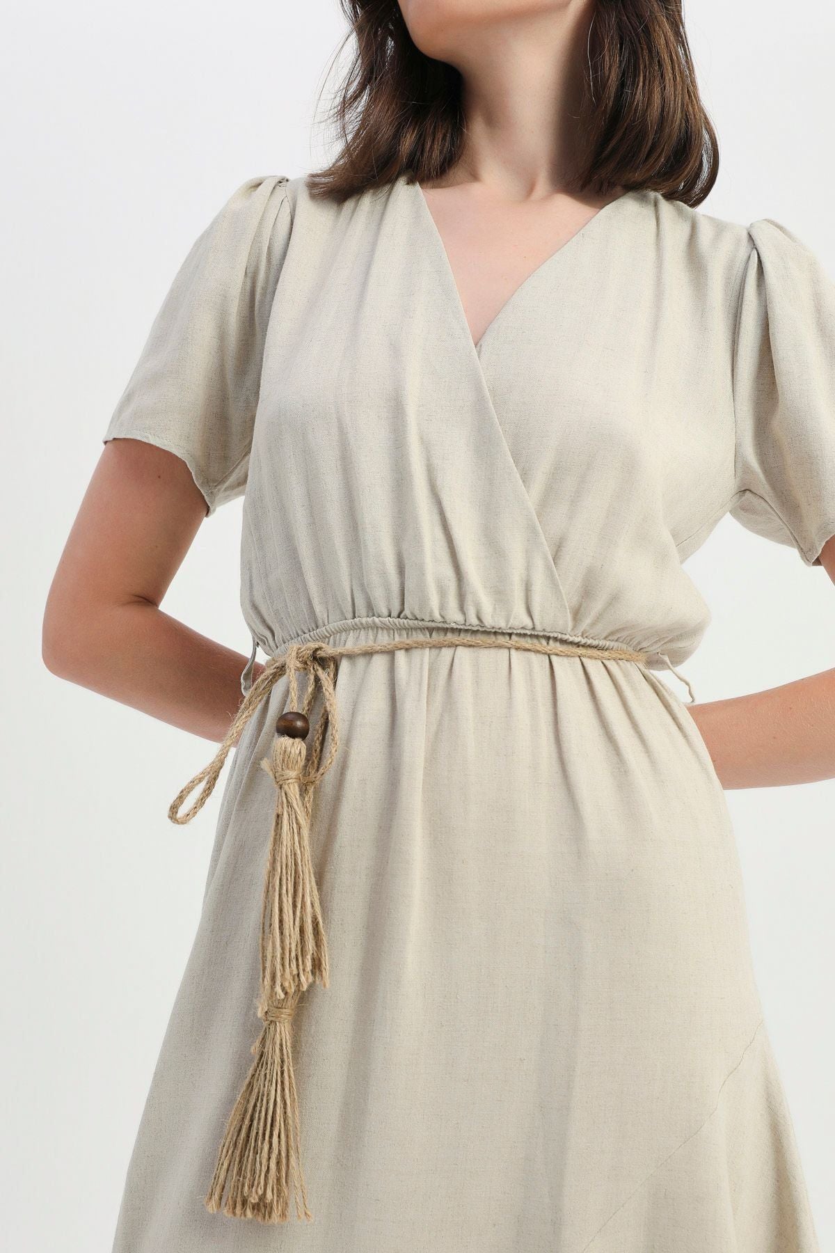 The dress, which is ready to be an unforgettable part of summer evenings with its remarkable straw rope belt detail and fashionable cut, is ready to take its place in your favorite combination.