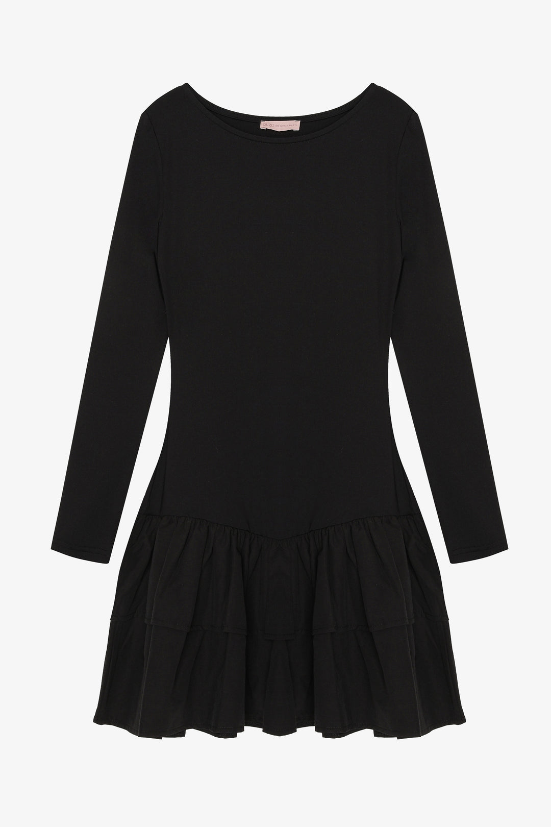 Yuvarlak yaka, uzun kollu, alt kısmı fırfır detaylı, esnek kumaş, kapamasız, içi astarsız, mini boy elbise.