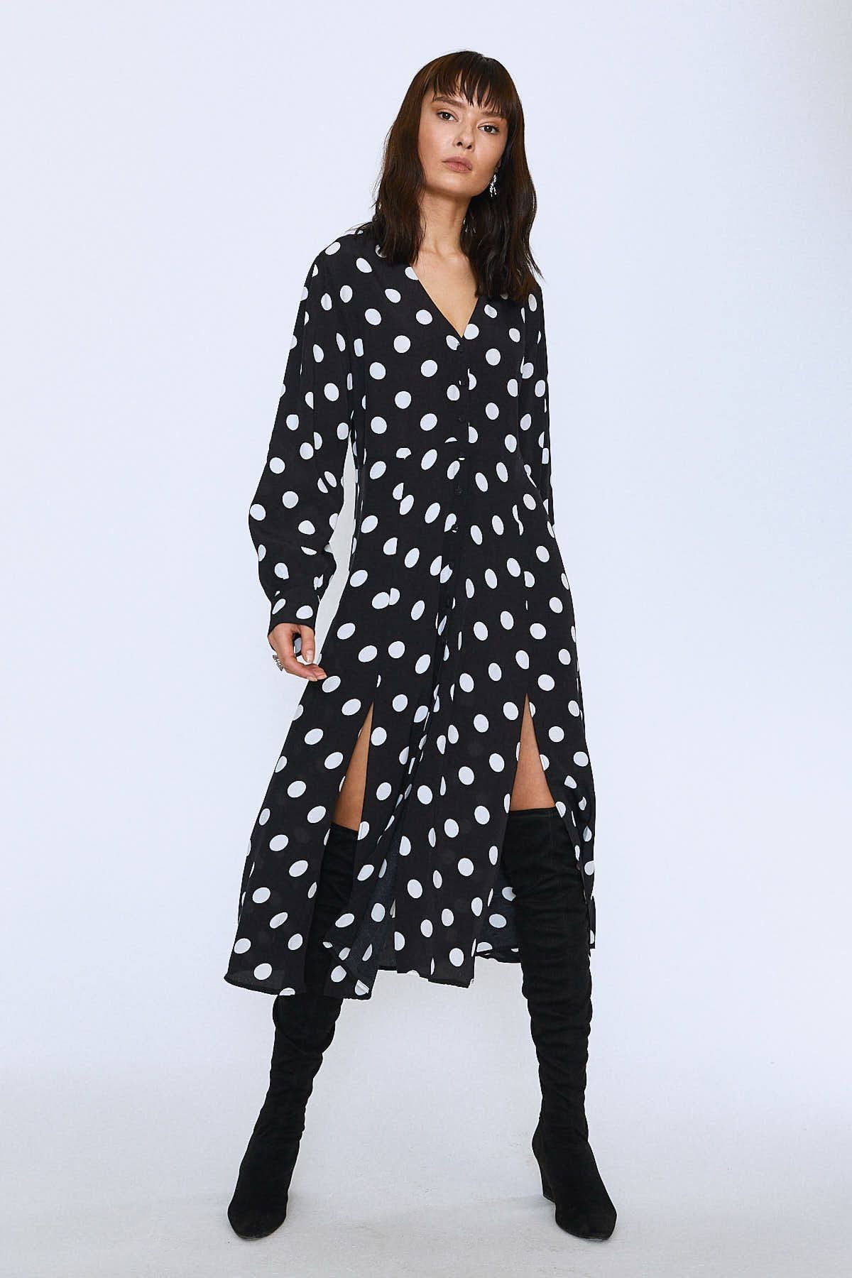 The dress, which will be among the indispensable clothing choices of cool weather with its long sleeve cut, is very attractive with its slit details on the hem.