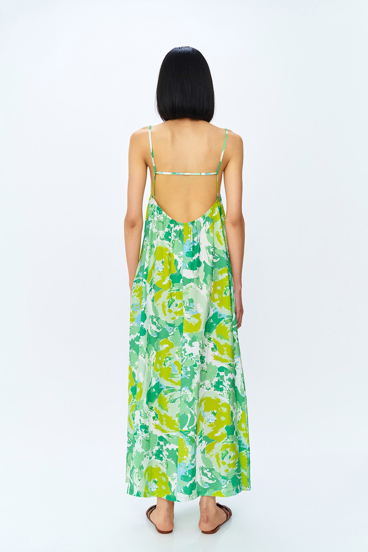 Renklİ, İnce askılı, sırt dekoltelİ uzun elbİse.