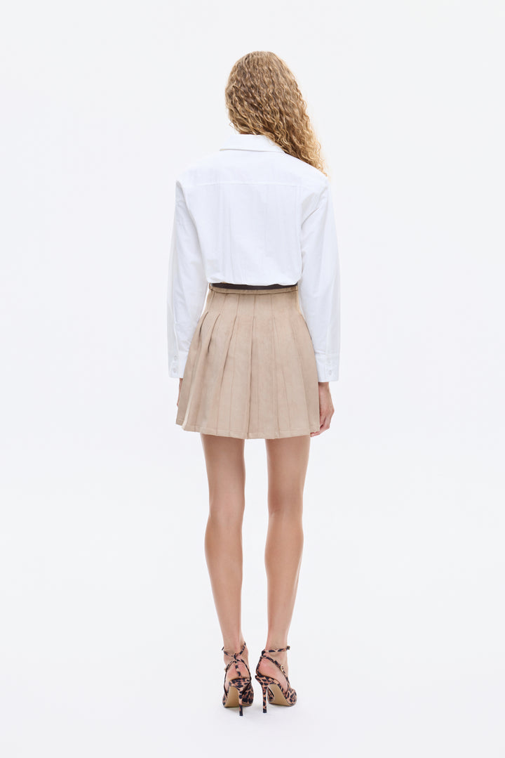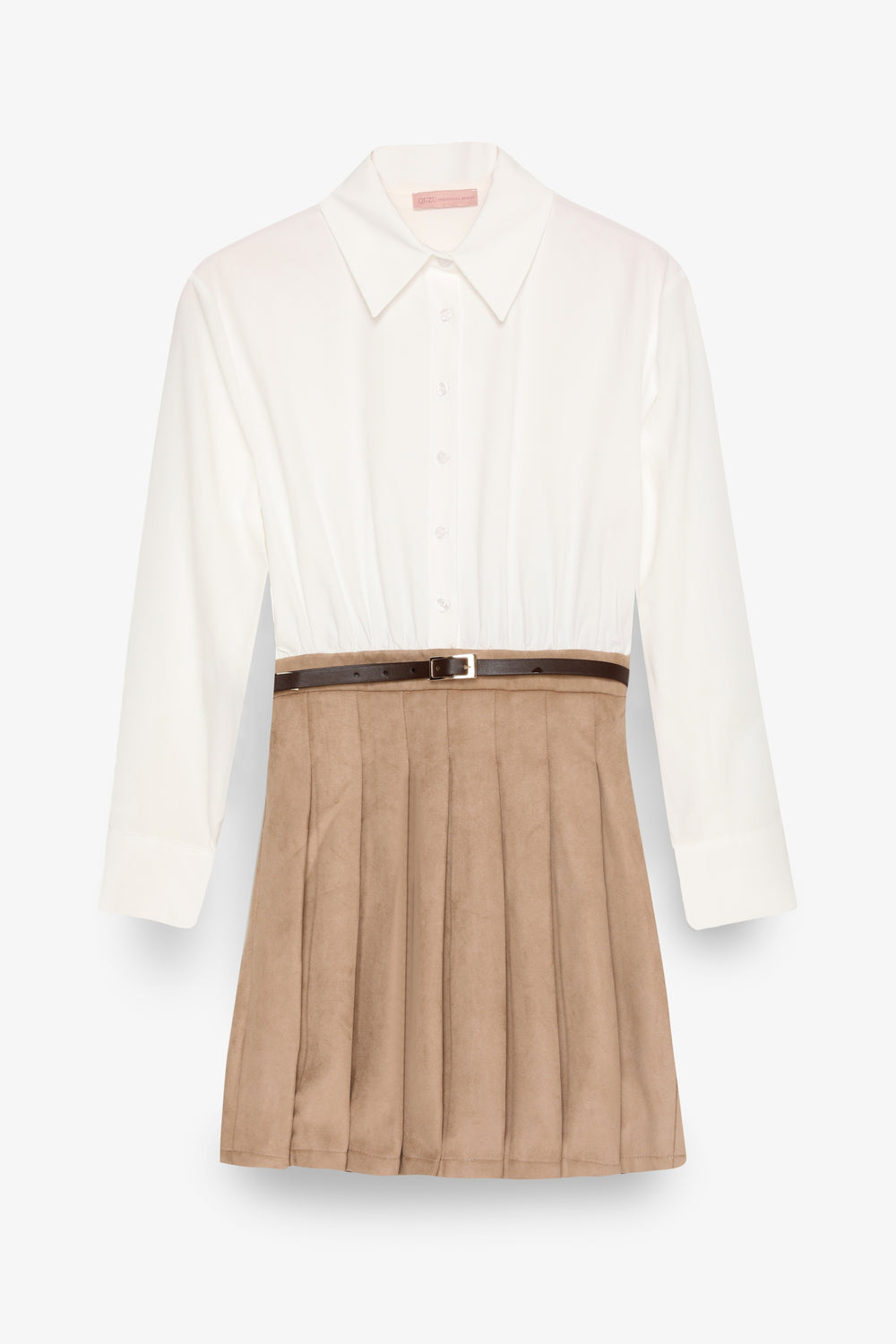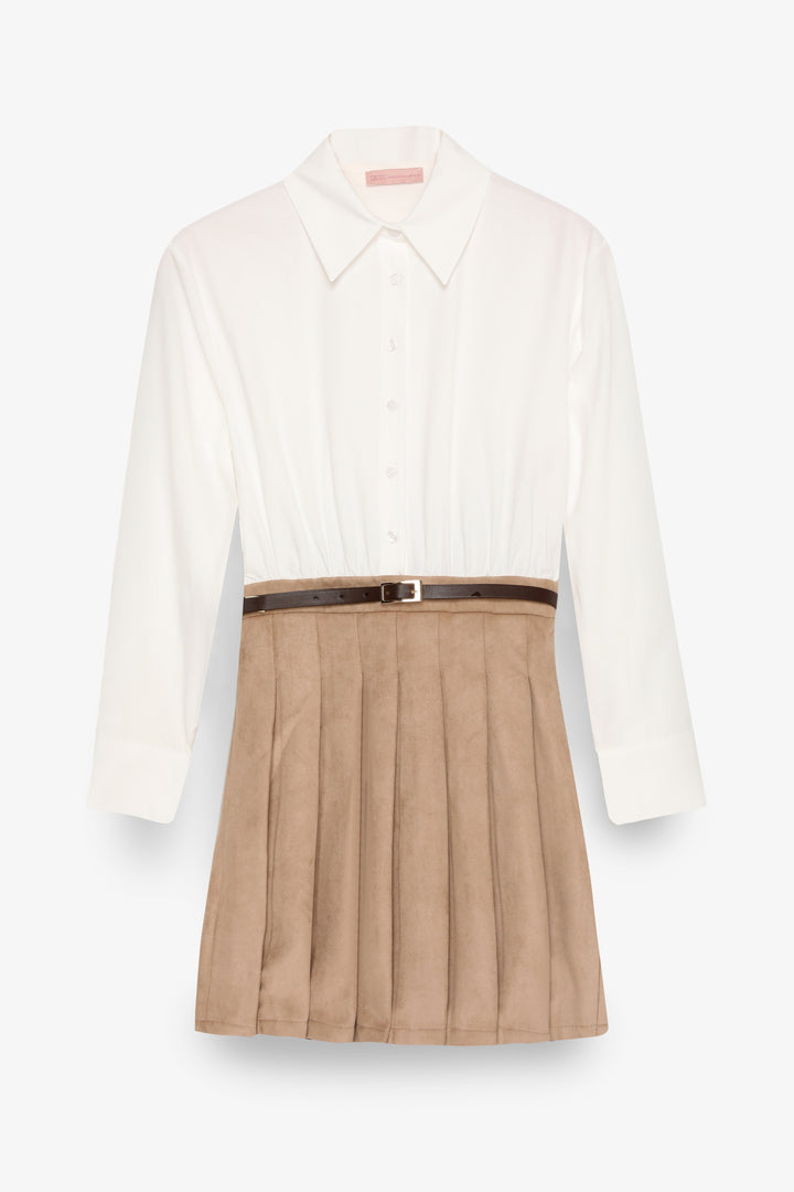Gömlek yaka, uzun kollu, üst kısmı gömlek formunda, alt kısmı pileli süet etek detaylı, kemer aksesuarlı, yandan fermuar kapamalı, astarsız, mini boy elbise.
