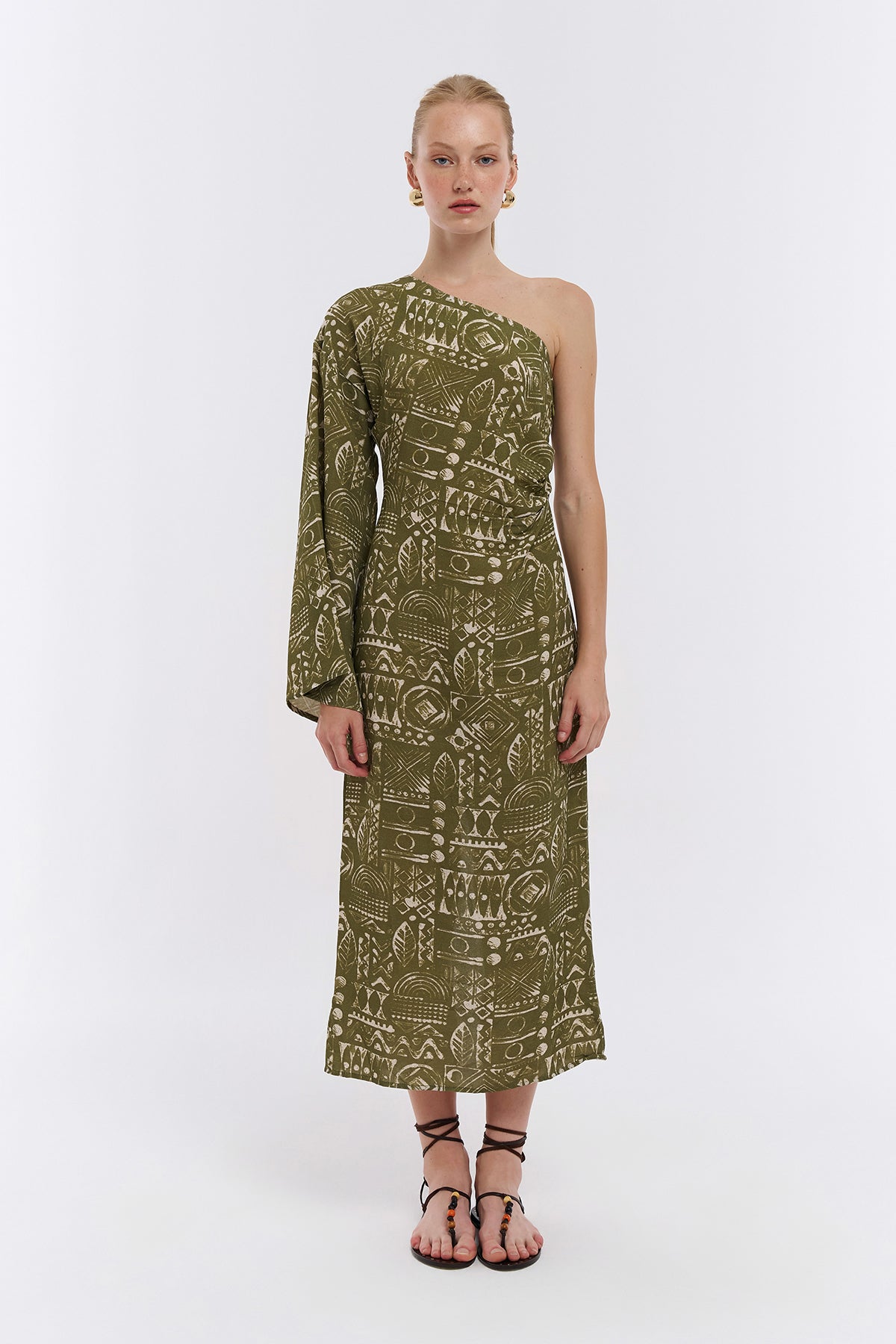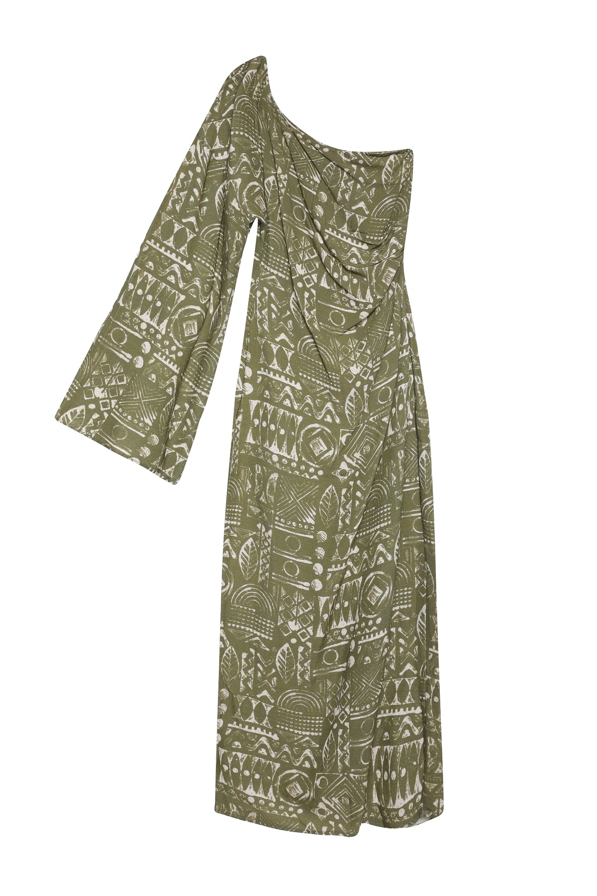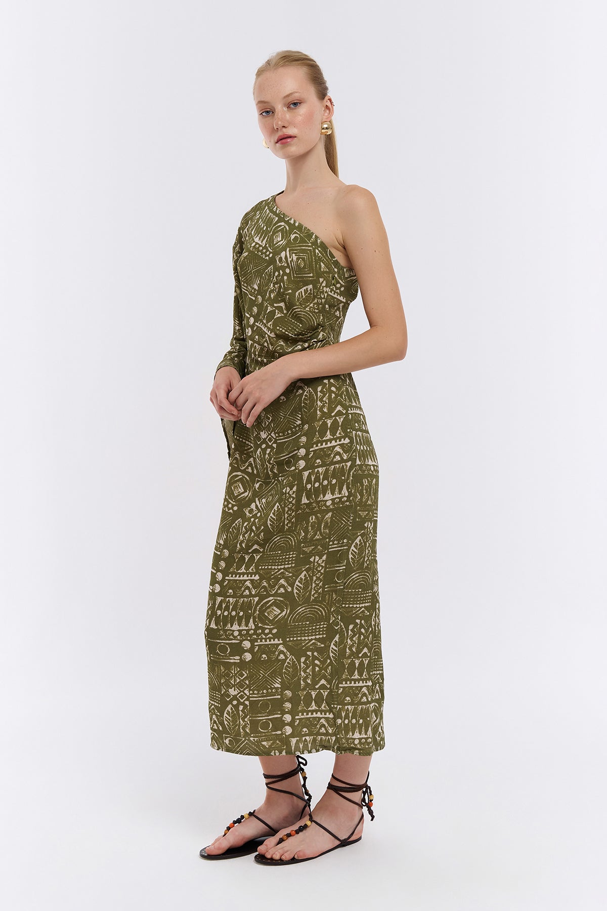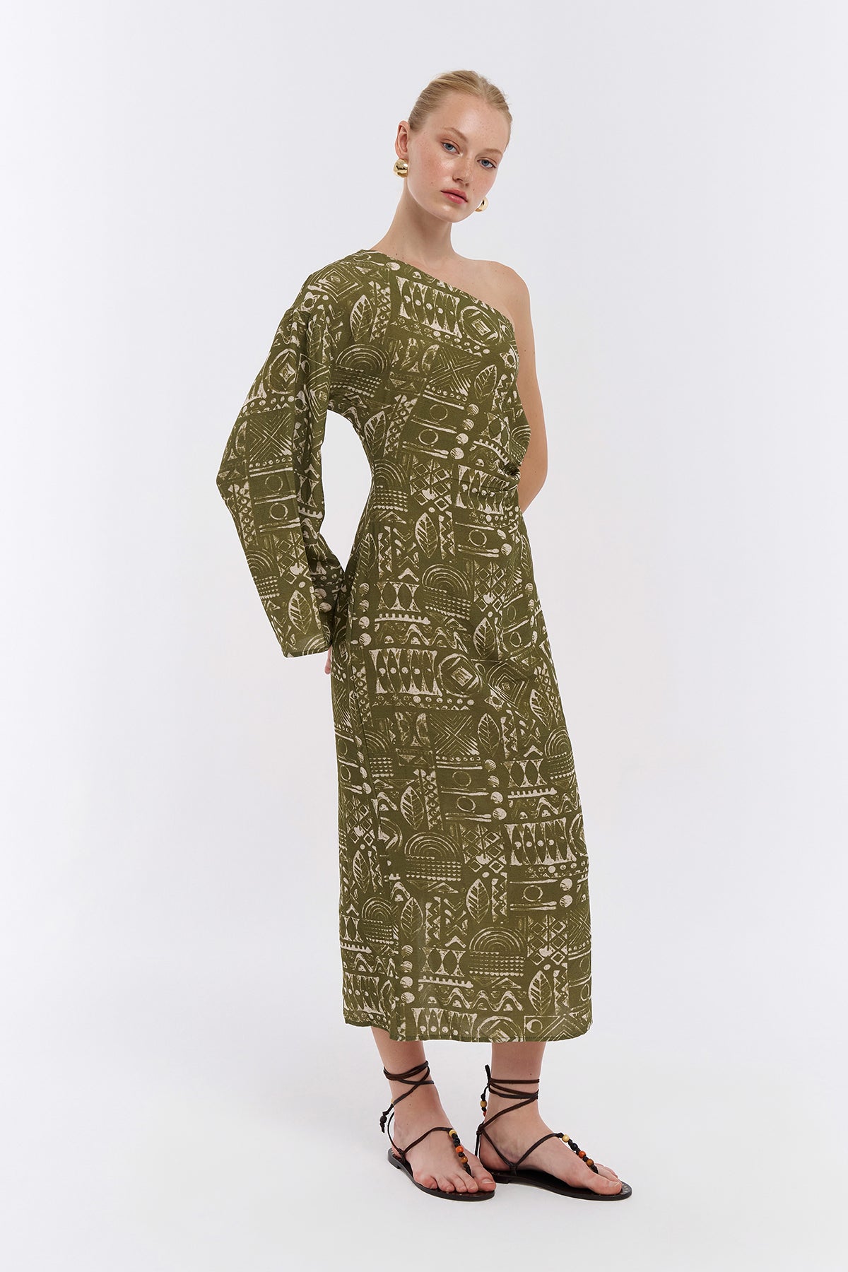 Tek Omuz Detaylı Desenli Midi Elbise Haki