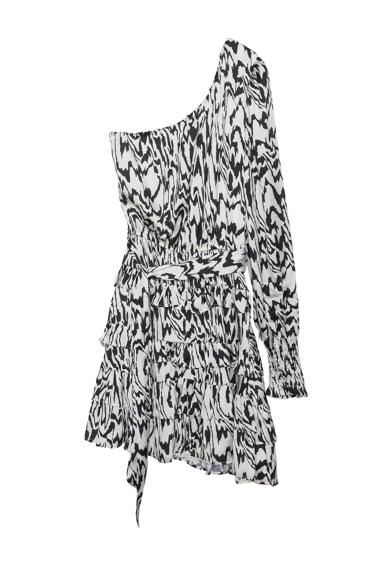 Tek omuz detaylı, saten yüzeylİ, belİ bağlamalı, katlı mİnİ elbİse.