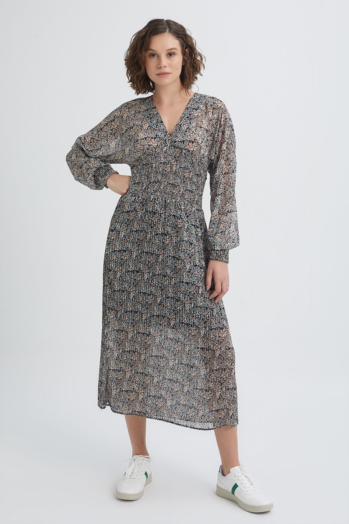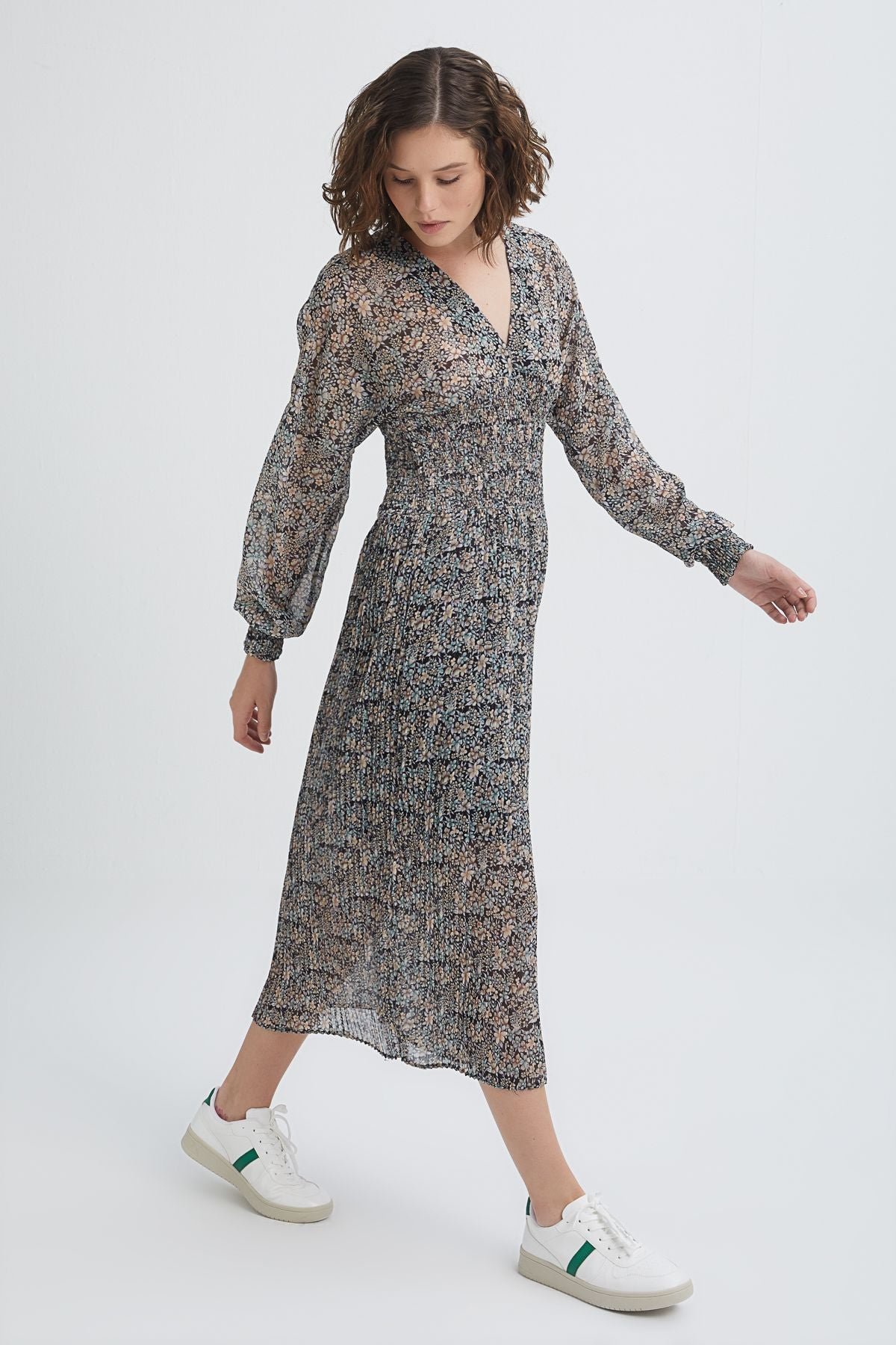 The dress, which draws attention with its gipe details, emphasizes the modern and elegant style together. You can complete your dress, which gives a more elegant feel with its V-neck, with sneakers.