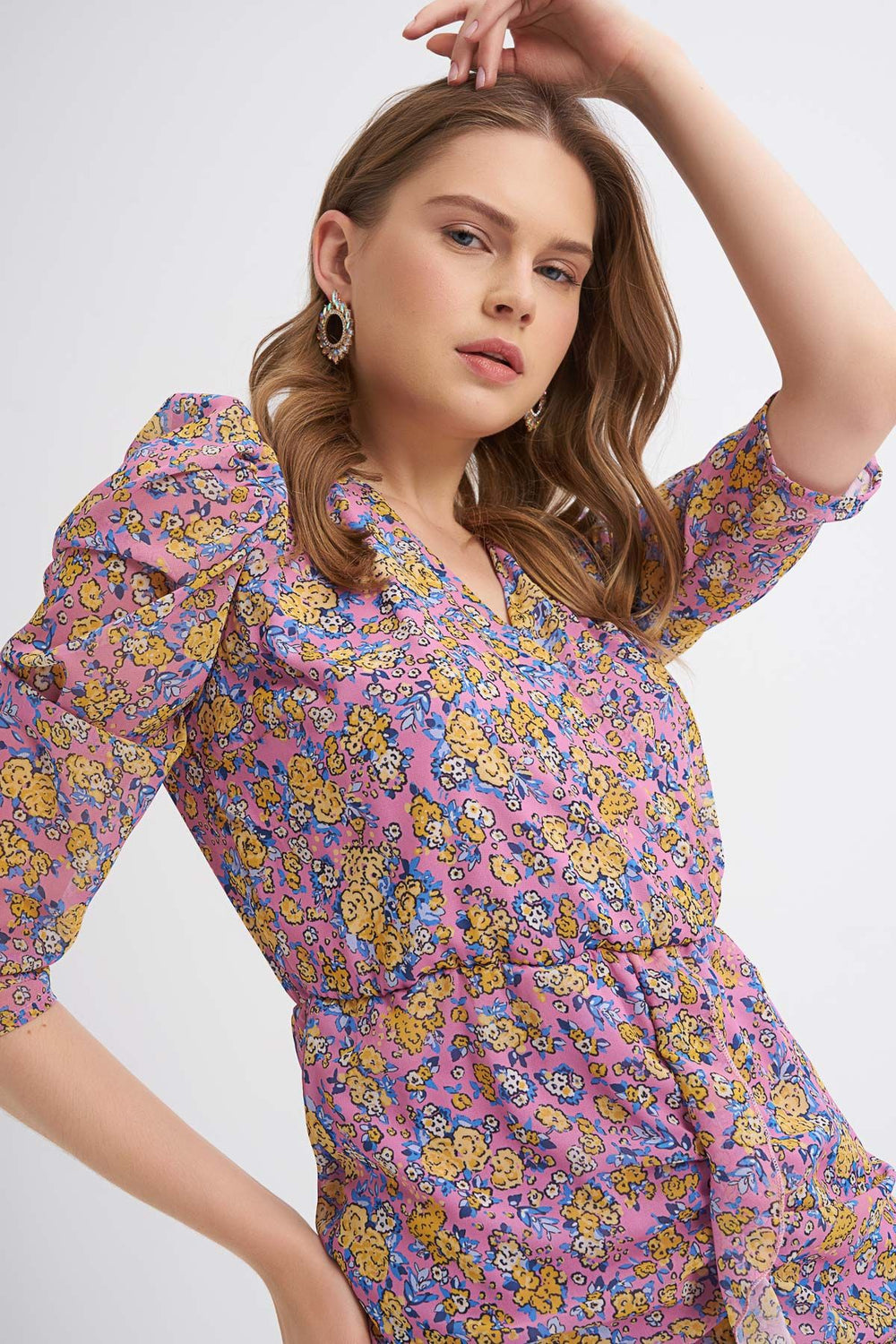 Patterned V Neck Balloon Sleeve Dress Fuchsia