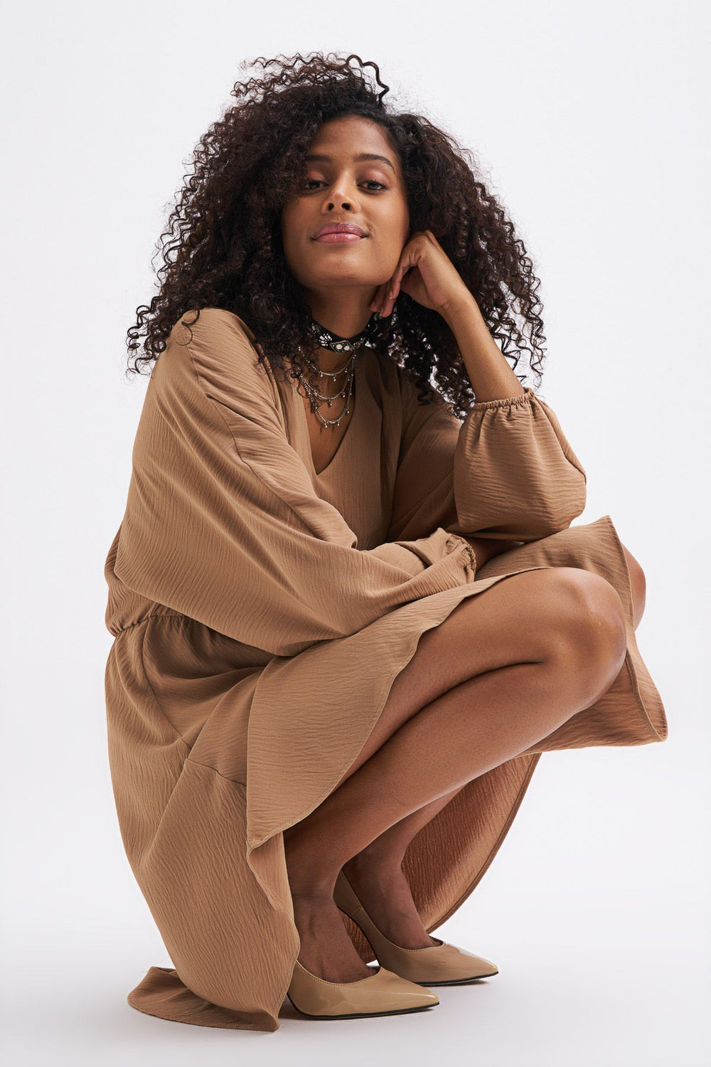 V Neck Midi Dress Camel
